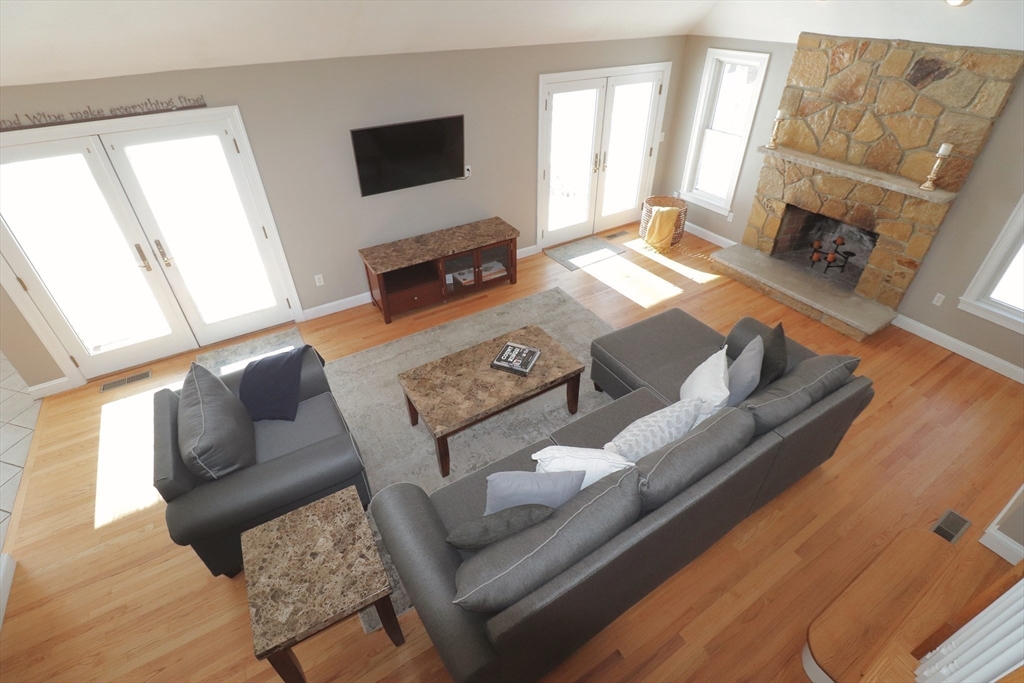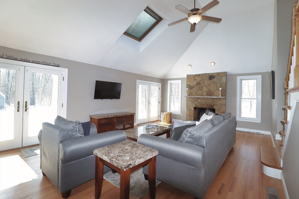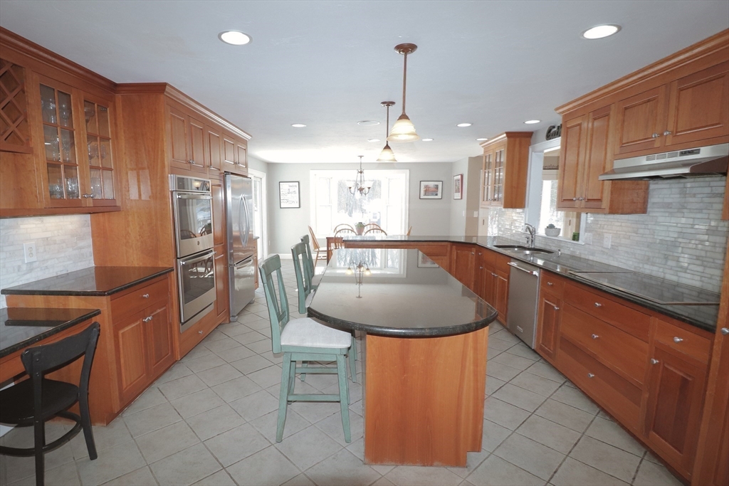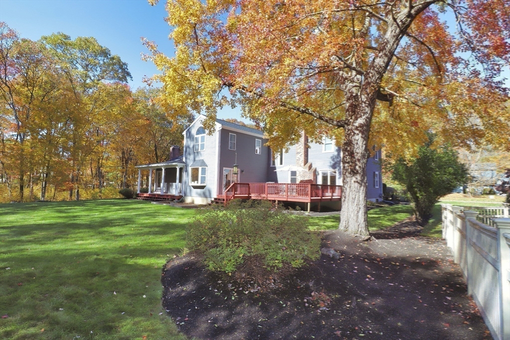 Nestled on a level, wooded acre-plus lot, this move-in-ready single-family home offers comfort, space, and beautiful natural surroundings. The chef’s dream kitchen features custom cherry cabinetry, stainless steel appliances, double wall oven, granite countertops, and an impressive 9+ ft island. Just off the kitchen, the sun-filled family room showcases vaulted ceilings, a skylight, stone fireplace, second staircase, and French doors leading to a stunning covered porch—perfect for enjoying your morning coffee.The living room is filled with natural light and includes a fireplace with additional access to the deck. A spacious dining room and dedicated office provide ideal spaces for entertaining and working from home. Upstairs are four bedrooms, including a spectacular primary retreat with picturesque windows, three walk-in closets, and a private en-suite bath. Enjoy indoor-outdoor living from the large deck off the kitchen—ideal for relaxing or hosting your next gathering.