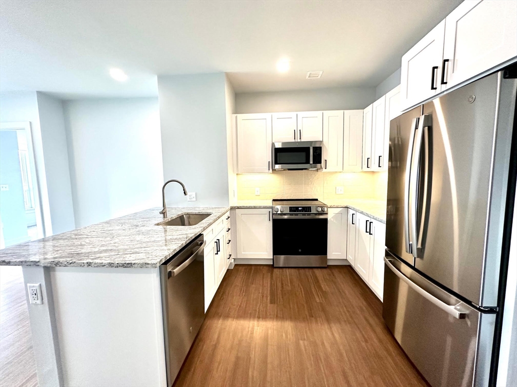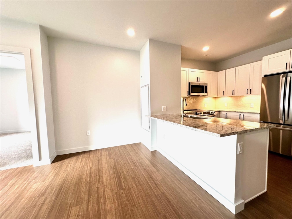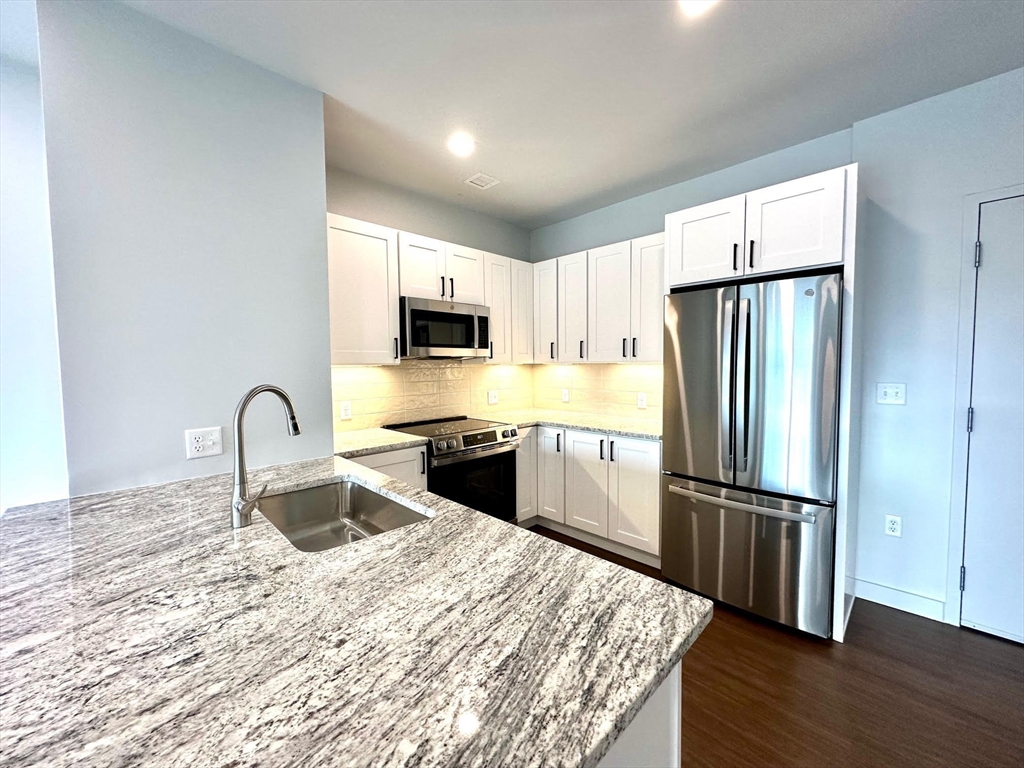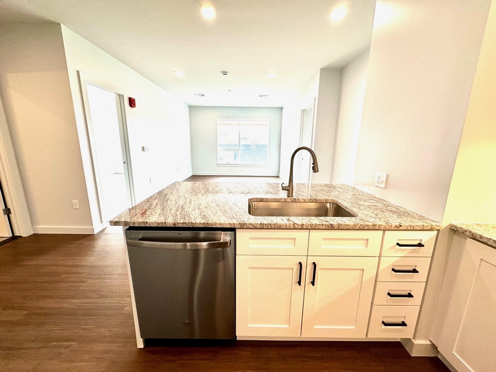 BRAND NEW mixe-use building in downtown Natick w/ 46 residential apartments. Unit 304 is a 3rd floor, 2 BED 1 BATH unit, about 908sqft. Kitchen has soft-closing cabinets (w/ under lighting), GRANITE counters, STAINLESS STEEL appliances, breakfast bar & an open floor plan w/ high ceilings. Flooring consists of engineered hardwood in common areas and carpeted bedrooms, tiled bathroom w/ walk-in shower. IN-UNIT WASHER & DRYER. Central forced air heat & COOLING. The building has 2 elevators, mail room, bike storage. Rental price includes 1 GARAGE PARKING space. PET FREINDLY BUILDING (additional monthly pet rent may apply). Roof deck for use in the summer months w/ furniture and grills provided by owner. The street level is commercail space w/ new businesses opening up. There are 3 upper levels of apartments. There are EV stations for use. Great location close to Commuter Rail, the Common, shops, restaurants and more.