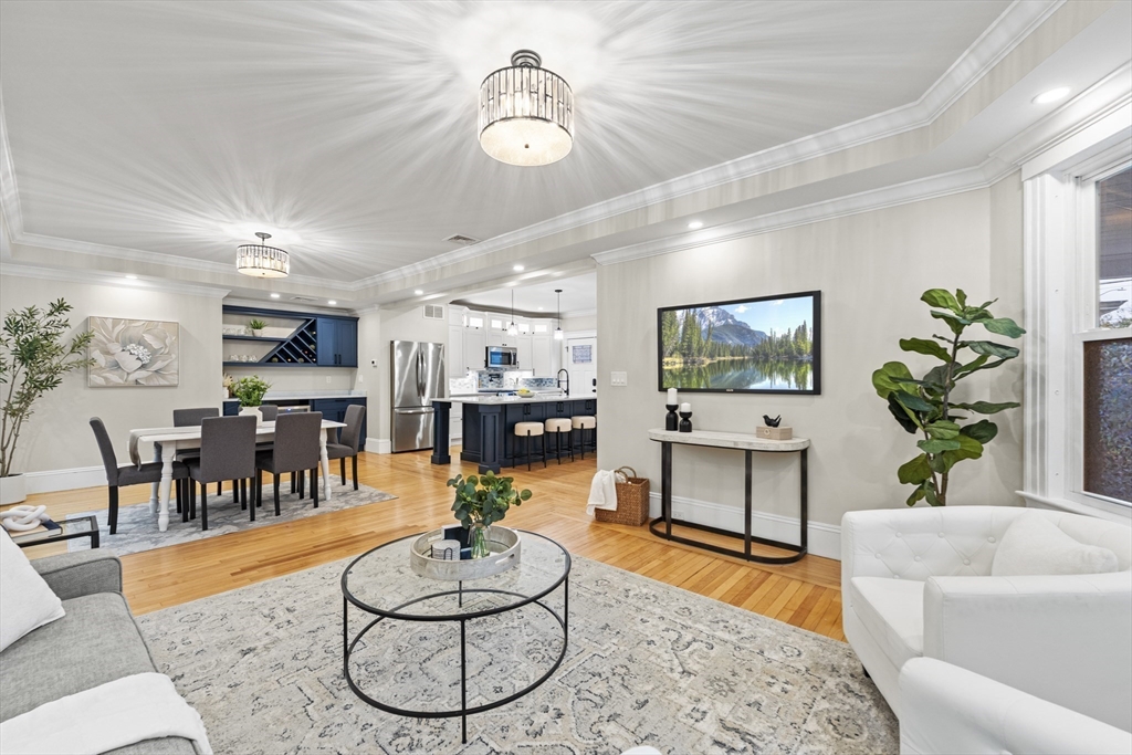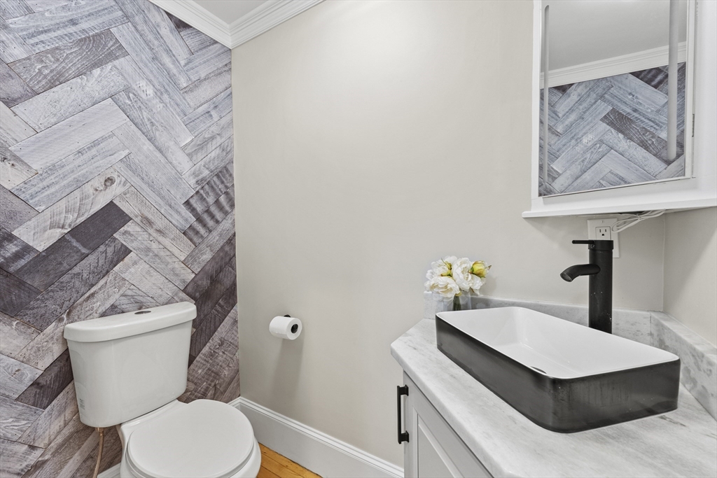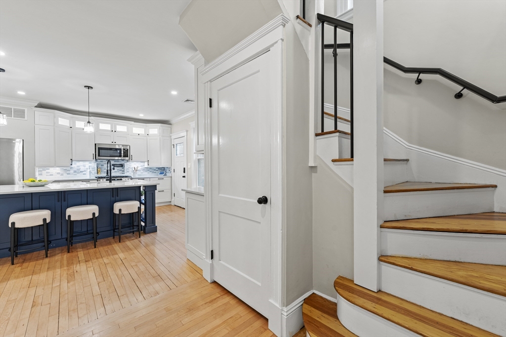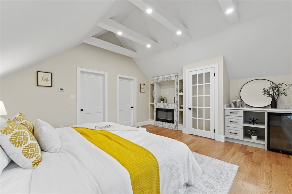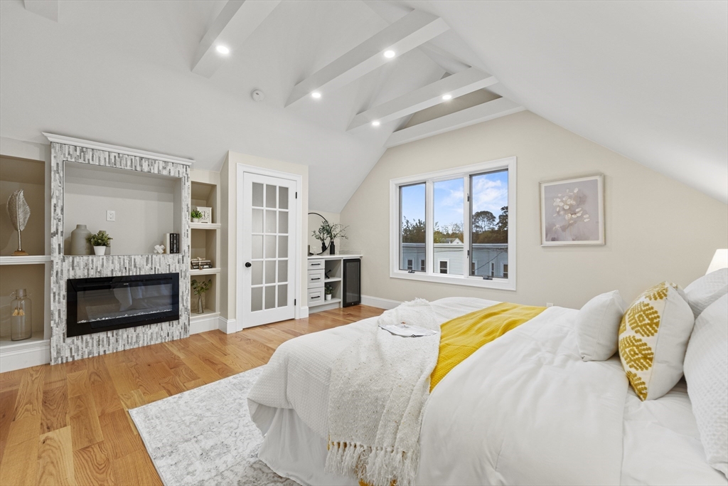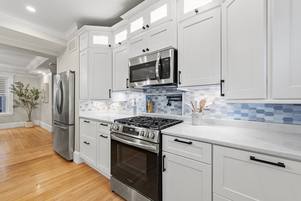 Beautifully designed three-level townhome-style condo offering a blend of modern finishes and thoughtful details throughout. The main floor features an open-concept kitchen and dining area with quartz counters, a 9' island, pot filler, pantry, and custom coffee bar. The second floor includes two spacious bedrooms, a bright office with French door, and a full bath with laundry and custom tilework. The third-floor primary suite offers a beamed cathedral ceiling, fireplace, beverage center, large dressing room, and spa-like bath with soaking tub, dual vanities, and separate shower. Enjoy a private porch, fenced yard with shared patio, and deeded off-street parking with garage. Conveniently located near downtown Salem, restaurants, the waterfront, and commuter rail.