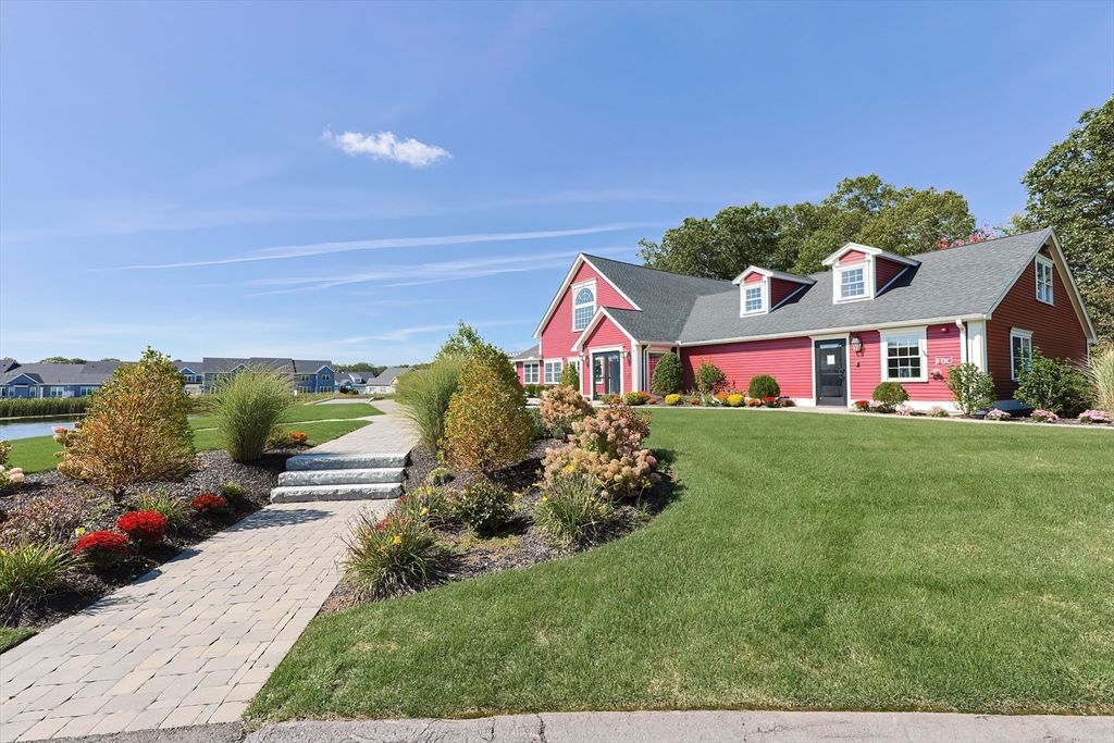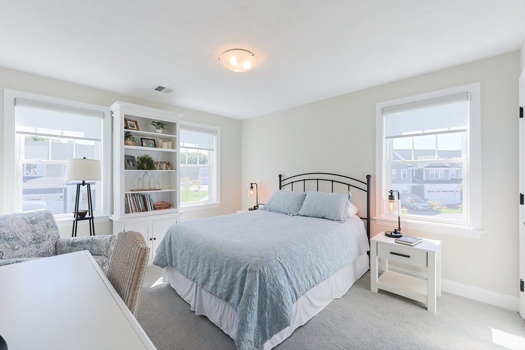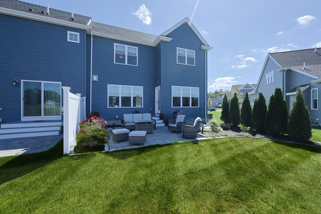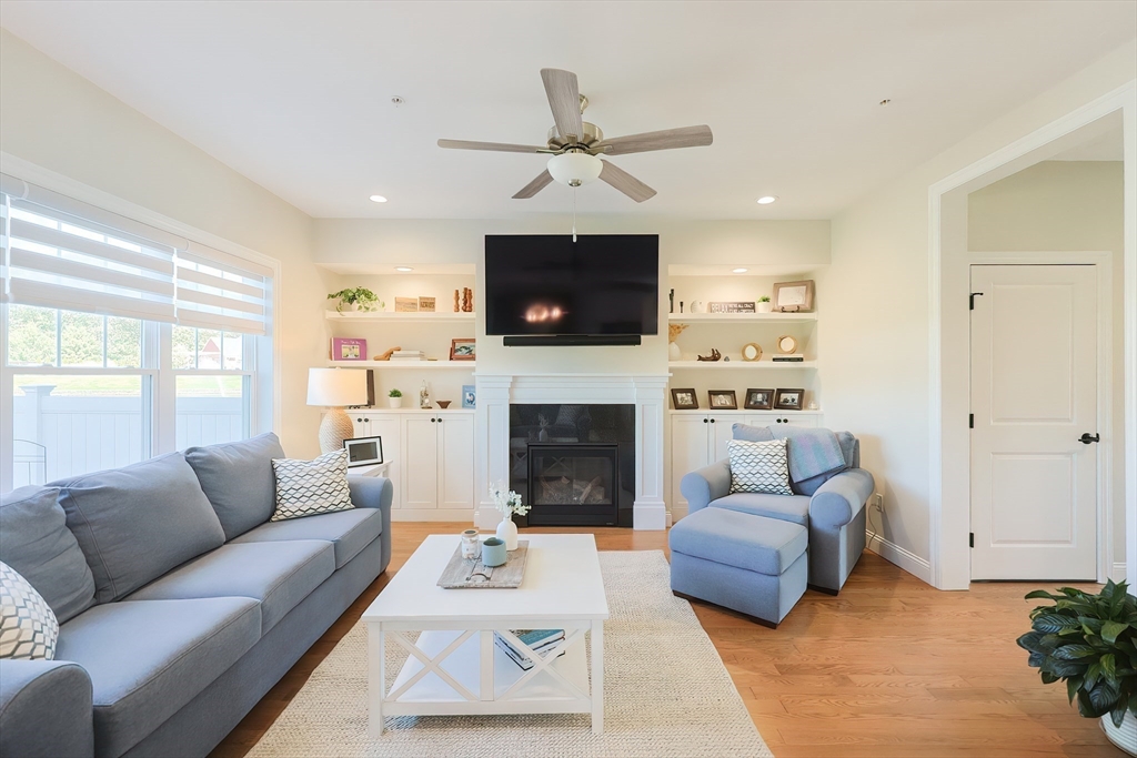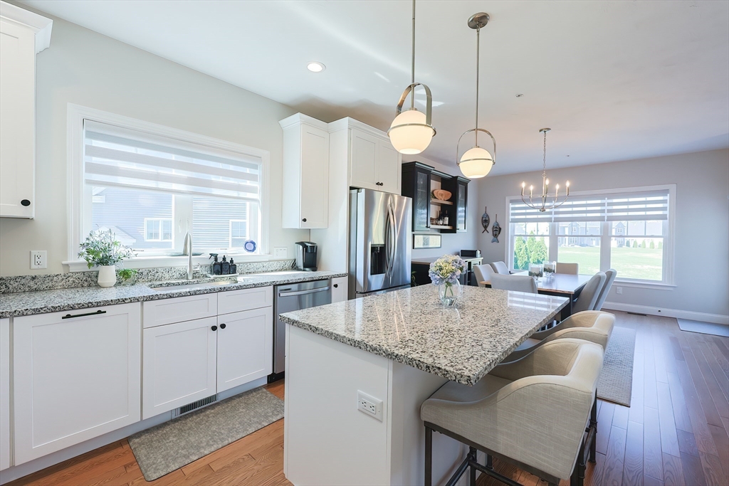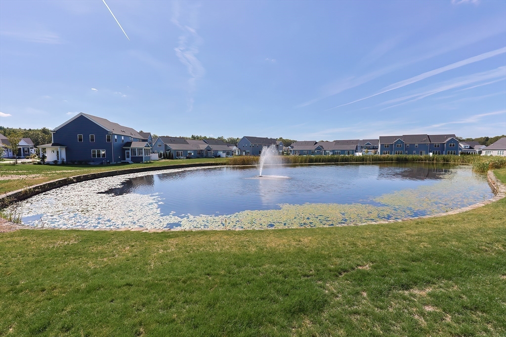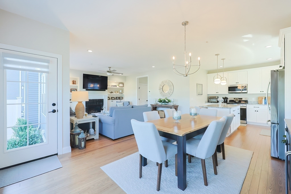PRISTINE END UNIT - RESALE in Bungay Brook Condominium Development located in a prime location overlooking the pond/fountain and features many custom upgrades. The open floor plan creates a perfect environment for hosting family gatherings and every day living. The living room, kitchen, and dining room all feature beautiful hardwood flooring, recessed lighting & custom blinds. Gorgeous built in cabinets and shelving are perfectly displayed on both sides of the gas fireplace. The dining room showcases a lovely custom built dry bar for additional storage and beverage refrigerator. The Kitchen is spacious with a center island, granite & stainless appliances. The second floor is roomy & features the main bedroom/ bathroom suite w/ walk in closet. The Guest Bedroom, Main Bathroom , den and laundry room complete the second floor. The Complex has a Club house which is perfect for hosting large events and also includes bocce court, pickle ball and outdoor seating & walking trails