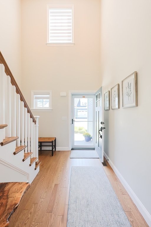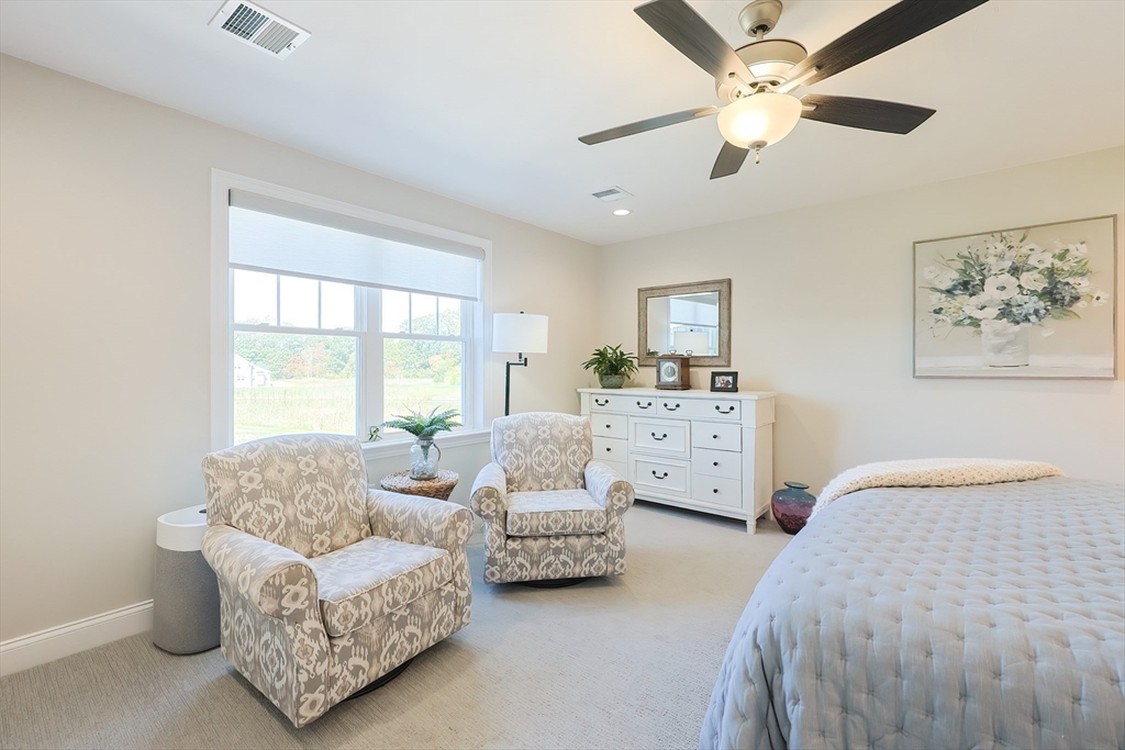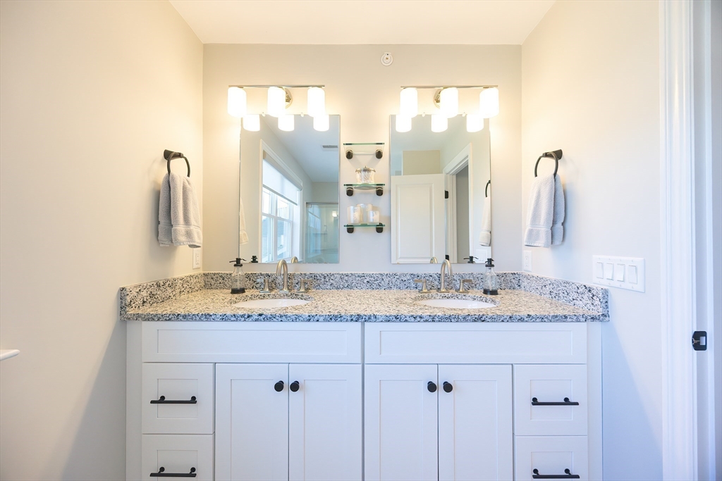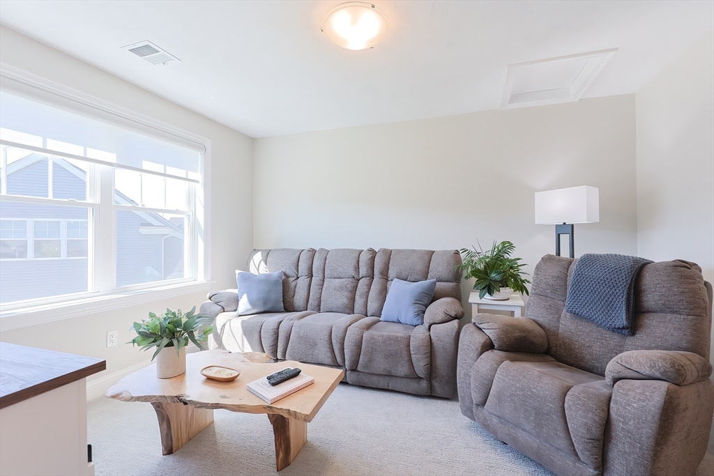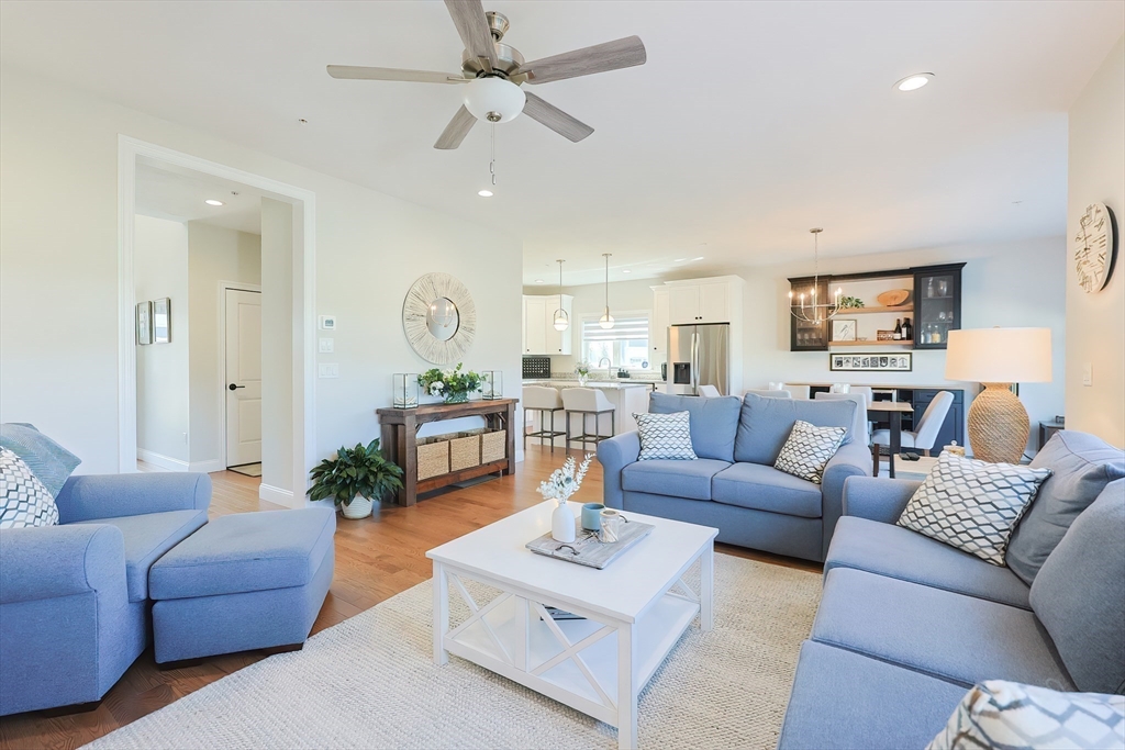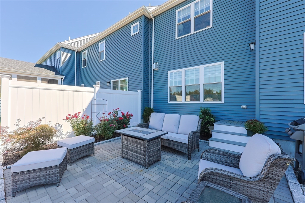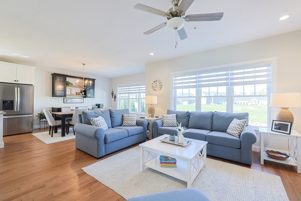 PRISTINE END UNIT - RESALE in Bungay Brook Condominium Development located in a prime location overlooking the pond/fountain and features many custom upgrades. The open floor plan creates a perfect environment for hosting family gatherings and every day living. The living room, kitchen, and dining room all feature beautiful hardwood flooring, recessed lighting & custom blinds. Gorgeous built in cabinets and shelving are perfectly displayed on both sides of the gas fireplace. The dining room showcases a lovely custom built dry bar for additional storage and beverage refrigerator. The Kitchen is spacious with a center island, granite & stainless appliances. The second floor is roomy & features the main bedroom/ bathroom suite w/ walk in closet. The Guest Bedroom, Main Bathroom , den and laundry room complete the second floor. The Complex has a Club house which is perfect for hosting large events and also includes bocce court, pickle ball and outdoor seating & walking trails