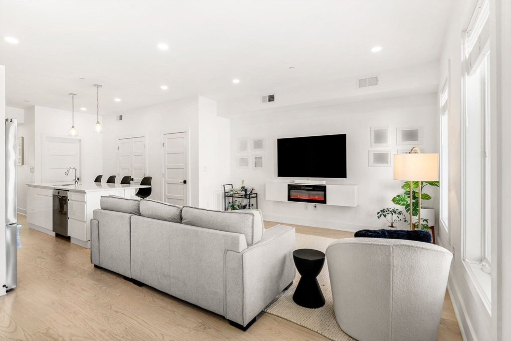 Located in the heart of Jeffries Point, this beautifully designed 2022-built condo offers refined city living in one of East Boston’s most desirable waterfront neighborhoods. This second-floor residence features soaring 11’ ceilings, oversized windows, and an open-concept layout filled with natural light. Highlights include central air, an electric fireplace, and curated designer finishes throughout. The chef’s kitchen showcases a quartz island and premium Bosch appliances, seamlessly connecting the living and dining areas. The home offers three bedrooms and two full bathrooms, including a serene primary suite with double vanity, glass-enclosed tiled shower, and private walk-out balcony. An assigned parking space adds rare convenience and long-term value. Ideally located near Piers Park, the East Boston Greenway, Maverick Square, the Maverick Square T stop, the ferry to Downtown Boston, waterfront paths, top local dining, and minutes to Logan Airport.