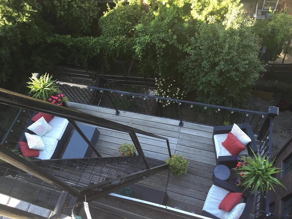 Available 3/1. Gorgeous South End penthouse offering both a private balcony and a roof deck (ladder access) with sweeping city views and unforgettable sunsets. The sun-filled open living area features soaring ceilings, a decorative fireplace, skylights, dramatic gabled windows, custom built-in storage, and cozy bench seating. The thoughtfully designed kitchen features granite countertops and stainless steel appliances and flows seamlessly into the living space, ideal for both everyday living and entertaining. Additional highlights include central air conditioning and in-unit laundry. Both bedrooms offer excellent closet space. The private balcony and ladder access to the roof deck is accessed through the smaller bedroom, currently used as an office. This bedroom is wide enough to accomodate a full or queen sized bed, or a pull out sofa/futon and desk. This is a lease break listed for less than the current tenants are paying, rent will escalate to $4400 on 9/1/2026.