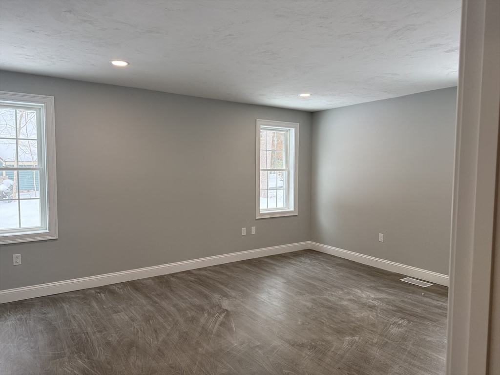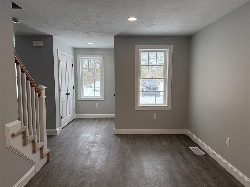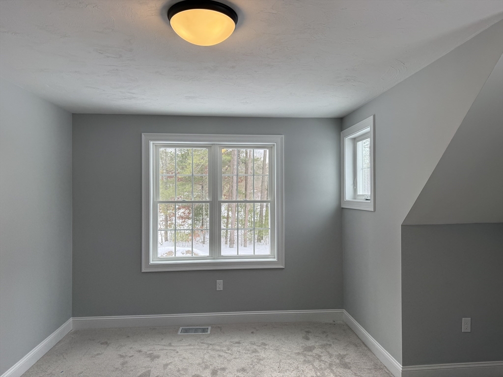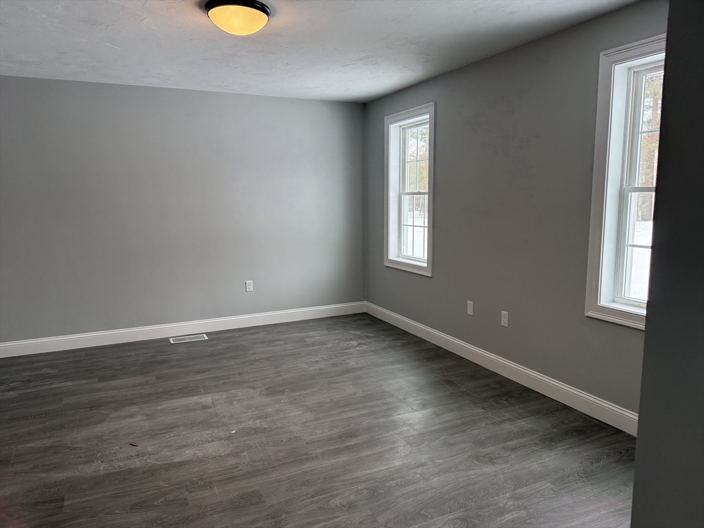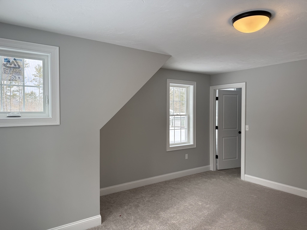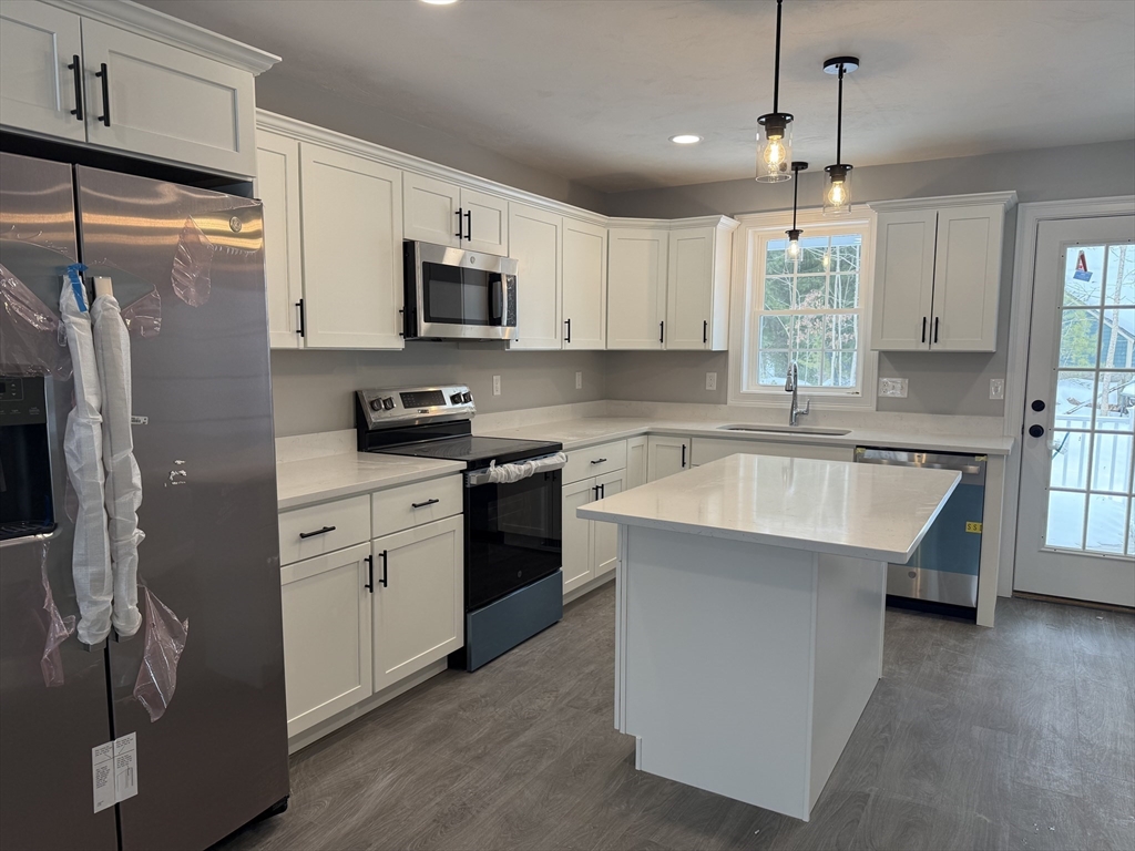 Exciting opportunity to rent a rare, brand-new 4-bedroom condominium offering 2,280 square feet of beautifully designed living space. This tastefully finished condo features a modern layout ideal for comfortable living and entertaining. The first floor offers a spacious primary bedroom with a private en-suite bath, along with a stunning kitchen featuring crisp white cabinetry, modern black hardware, stainless steel appliances, and a large island with quartz countertops. Ample cabinetry provides excellent storage. Sliding doors off the kitchen lead to a private balcony overlooking manicured lawns, perfect for relaxing or entertaining. A convenient half bath completes the main level. Upstairs are three generously sized bedrooms and a full hallway bath, offering flexible space for guests, family, or a home office. Additional highlights include central air conditioning and low-maintenance living. Ideally located minutes from a highway exit with easy access to Cape Cod, Boston, Plymouth,Etc