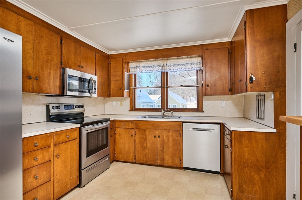 Picket fence charm and classic farmhouse appeal on 1.68 acres, just minutes to colleges and shopping.This inviting home offers flexible living with large rooms and a layout ideal for today’s homestead lifestyle. The first floor supports single-level living with a kitchen, bedroom, 3/4 bath and a home office or bonus/fourth bedroom featuring built-ins, a desk and storage.The large mudroom also serves as the laundry room and pantry. With original wide-plank wood floors, the open living-to-dining space is filled with natural light. Upstairs are two additional bedrooms, one with large walk in closets, and a full bath (renovated 2019). The heated two-car garage has its own separate electric panel and is solar ready. Outdoors, enjoy a partially fenced yard with room for gardens, animals, or gatherings under the open sky. All this within walking distance of Leverett Pond, Library, elementary school, post office and LC&A. New furnace, oil tank, electrical, garage and septic in 2019.
