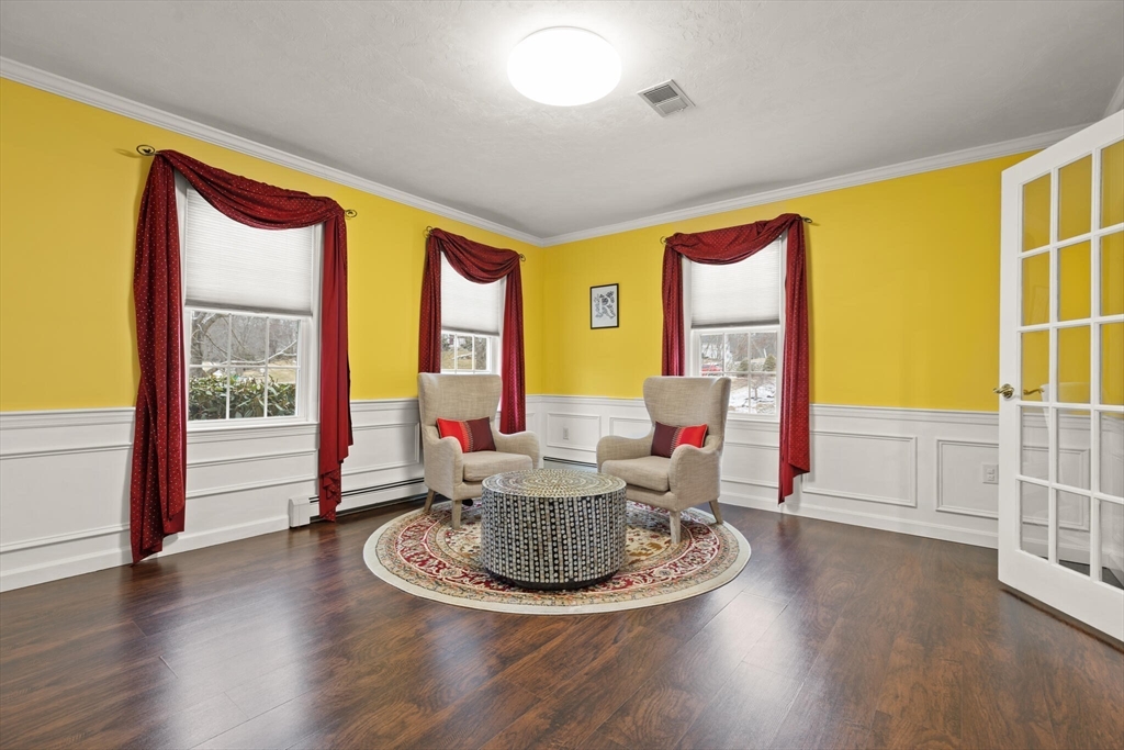 This beautiful center hall Colonial offers a layout well suited for multi-generational living. The first-floor IN-LAW SUITE features a private entrance and includes a living room, kitchen, full bath, bedroom, and access to a backyard deck. A connecting door provides optional access to the main house while maintaining separation.The main residence is a 4 bedroom colonial with 2 ½ baths and laundry. The kitchen opens to a family room with a cathedral ceiling and fireplace. A separate formal dining room supports traditional entertaining, while a large front room with French doors provides additional space that can be used as an office, den, or formal living room. The exterior includes a rear deck and generous yard bordered by wooded town land, offering added privacy. The walkout finished basement provides additional finished space suitable for a variety of uses. Enjoy flexible living options and a practical floor plan designed to accommodate a range of household needs.