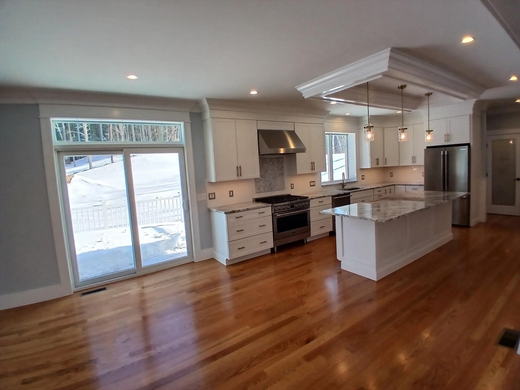 NEW CONSTRUCTION, ready for occupancy, abuts 200+ acres of conservation land with direct access to trails. Sun-filled open concept floor plan with 9' first floor ceilings.The center piece of the 1st floor is the expansive custom kitchen with 9' granite island, coffered island ceiling, breakfast bar and a walk-in pantry. Kitchen opens to an inviting family room with a coffered ceiling and gas fireplace. Kitchen patio door leads to a composite deck overlooking scenic woodlands.Convenient 1st floor Study/Guest bedroom with full bath. Formal tray ceiling dining rm. 2nd floor features primary suite with sitting area, large walk-in closet and beautiful ensuite bath with a comforting soaking tub alcove. Laundry room, two additional bedrooms and a full bath. Enjoy the flexibility of the bright and spacious finished 3rd floor, includes a bedroom, bonus room and full bath. Partially finished basement with double hung windows provides an abundance of natural light, perfect for future bonus room.