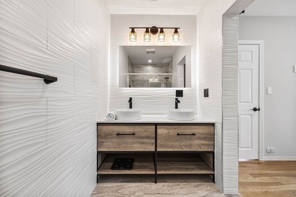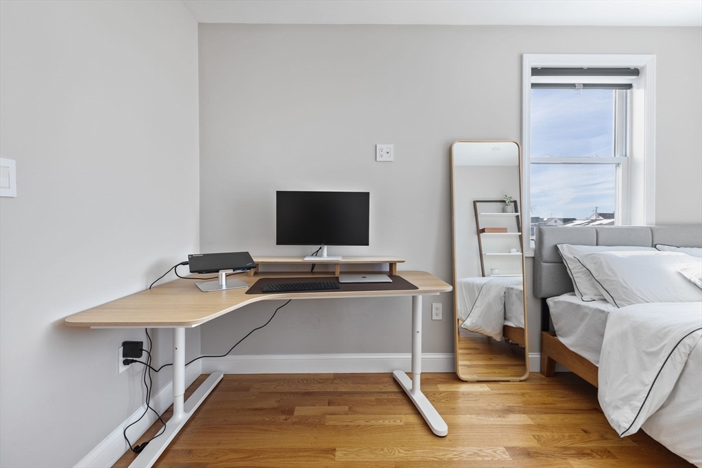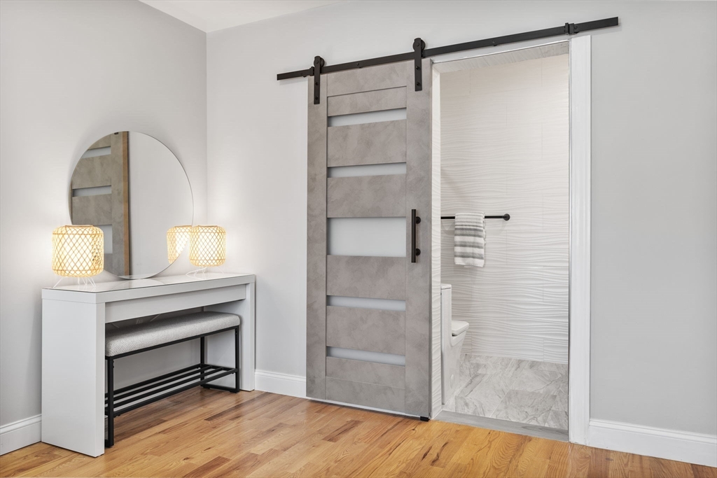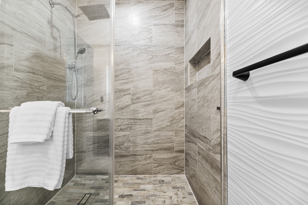 This beautifully built 2022 single-family home offers 3 bedrooms and 2 full baths across two comfortable levels of living. With all big-ticket items just a few years old, the home provides a low-maintenance lifestyle with modern systems and finishes throughout. The main floor features an open-concept layout with hardwood floors, recessed lighting, and direct access to an oversized deck overlooking a spacious yard, ideal for everyday living and entertaining. The kitchen is bright and modern, finished with timeless shaker cabinetry, subway tile backsplash, quartz countertops, and a waterfall peninsula for seating. As you go upstairs, a chandelier-lit landing leads to a welcoming foyer, two generously sized bedrooms, and a primary suite with a private full bath featuring a double vanity. Additional highlights include three off-street parking spaces, an EV charger, and a laundry area with extra storage. Ideally located close to Revere Beach, the Blue Line at Wonderland Station, & Route 1.