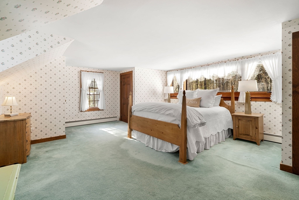 Perfectly blending home and location, this inviting property offers timeless charm with exposed beams, a cozy fireplace, and a stunning kitchen, all set against a spectacular yard with mature plantings and great curb appeal. The 1st floor features an open-concept kitchen w/beautiful custom cabinetry and exceptional counter space, flowing into an oversized dining room w/scenic views and hardwood flooring. The living room is a standout with soaring ceilings, a wood-burning fireplace, built-in cabinetry, and a balcony overlooking the space, creating a warm, welcoming feel. Two additional versatile rooms, ideal for bedroom and office use, plus a bath complete this level. The second floor offers two large bedrooms, primary with 3 closets, loft space w/balcony overlooking the living room, and updated full bath.Outside, enjoy stunning green space, a charming screened porch, shed, on over 2 acres, close to trail access. Truly special home blending charm, modern amenities, and unique features.