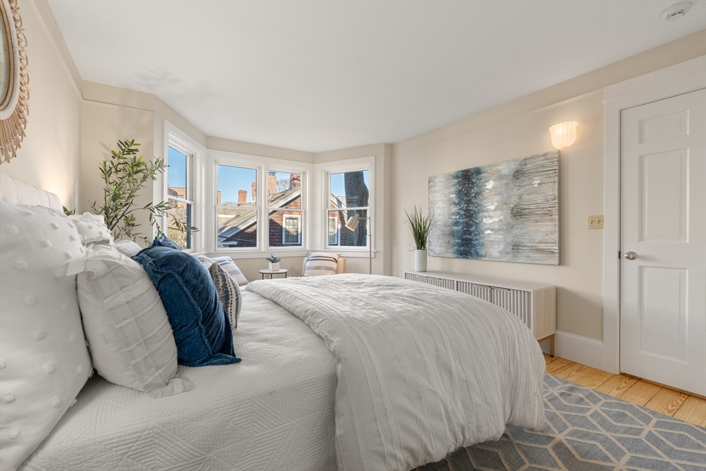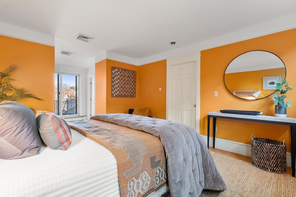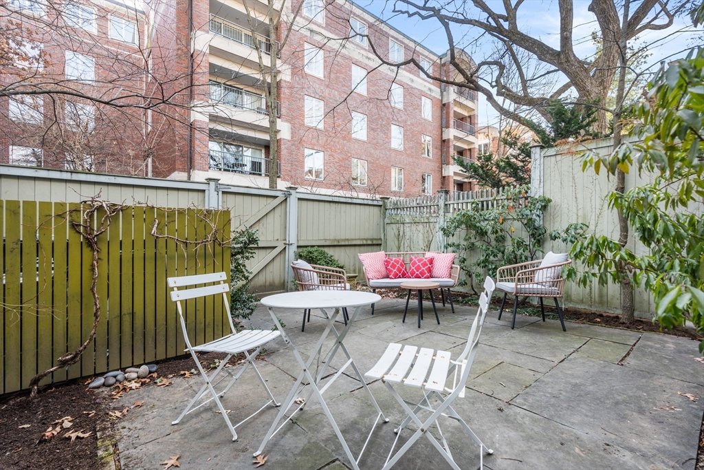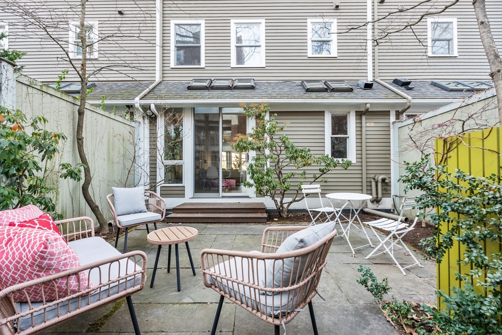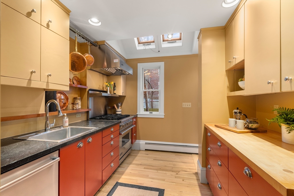 This special offering displays a timeless blend of contemporary and Victorian design throughout. The striking foyer has floor to ceiling built-in bookcases. A 35' living/dining room offers a bay window, 3 skylights, and sliding glass doors to the private fenced-in garden & patio. The European-inspired kitchen showcases a Viking & SubZero stainless steel appliances, custom cabinetry, stone & butcher block countertops, and 2 more skylights. The 2nd floor houses 2 bedrooms each with a double closet, a hall bath, and laundry room. The primary suite occupies the entire top floor, with a landing area with a skylight & walk-in closet, extra closets, a sitting area, en-suite bath, and sliding glass doors to the private roof deck. The lower level offers a 27' family room, bathroom, and large storage/utility room with extra laundry hookups. Other amenities include professionally managed & maintained deeded parking, which includes snow removal. Located around the corner from restaurants & shops.