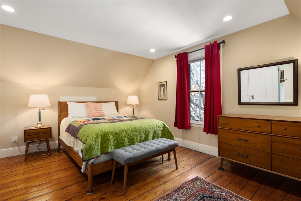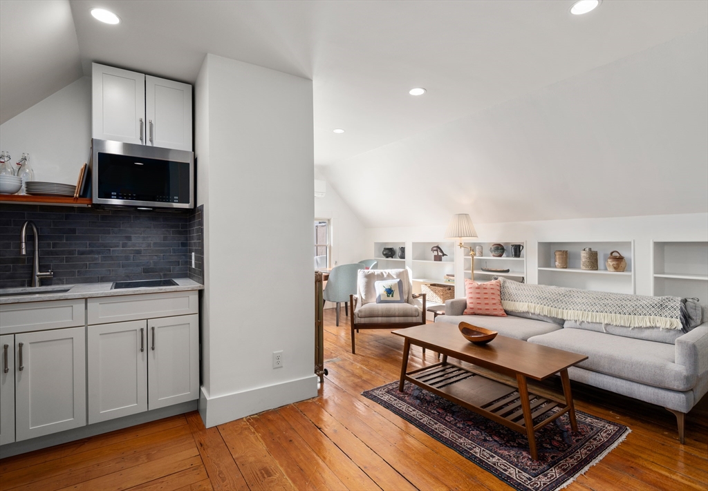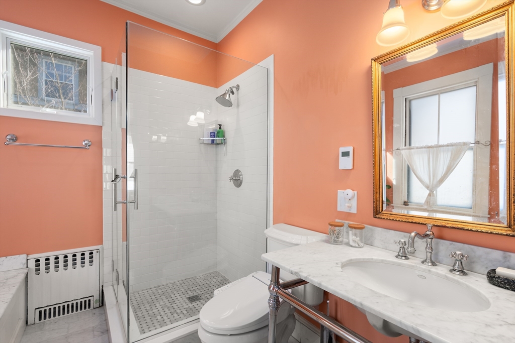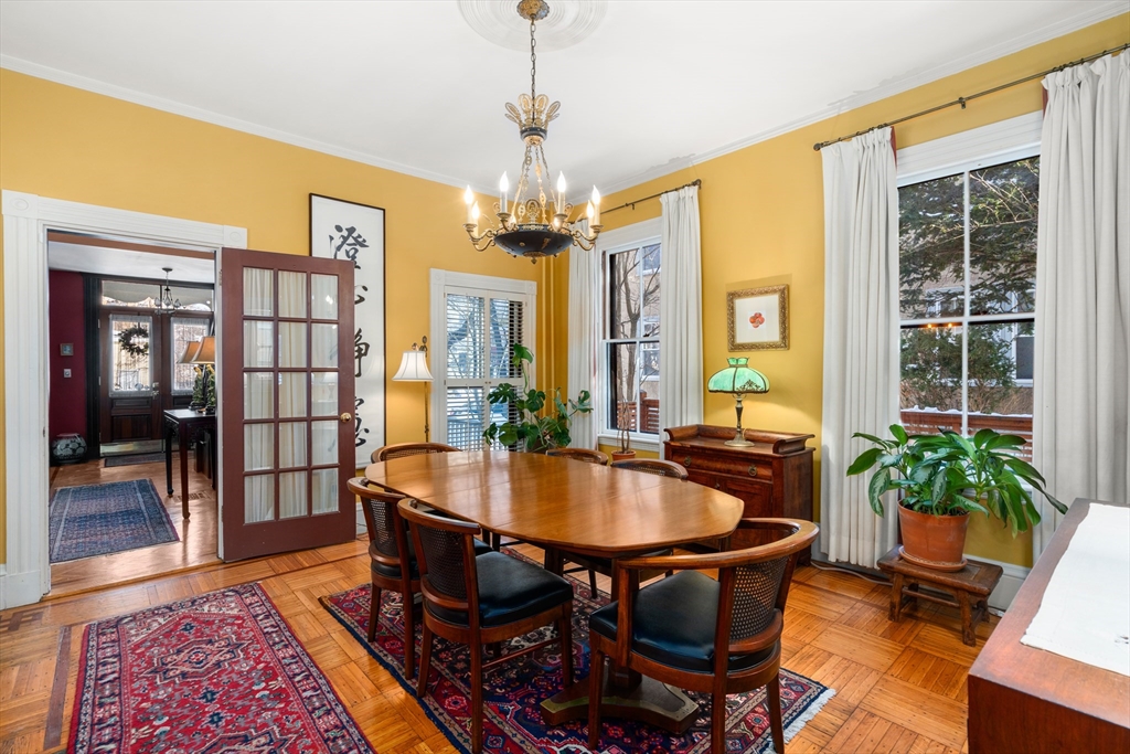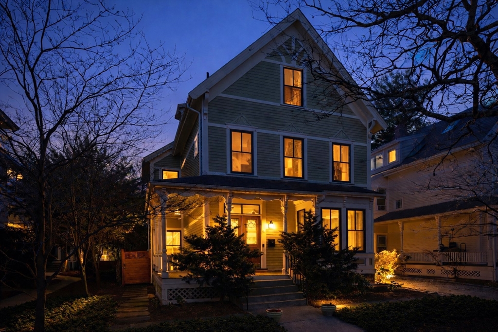 Through the foyer with parquet inlaid floors, this grandly scaled home offers period features such as soaring ceilings, bay & box windows, and pocket doors throughout. The 19' formal living room opens to the family room and adjacent dining room. The updated kitchen provides soapstone countertops, a 5-burner Viking stove, counter peninsula for bar seating, pantry, and direct access to the bluestone patio which is plumbed for a gas firepit. Upstairs, the 23' primary bedroom offers a large walk-in closet, and 4-piece en-suite bath with radiant heat. There are 2 more bedrooms and a hall bath on this floor. The top level houses the guest suite, complete with a living/dining area, 16' bedroom, in-unit laundry, full bathroom, kitchenette, and a 19' roof deck. The unfinished lower level hosts the laundry area with sinks, and bulkhead exterior access. Ideally located just blocks from Porter Station and the Porter Square Galleria, offering easy access to destinations by bike or public transit.