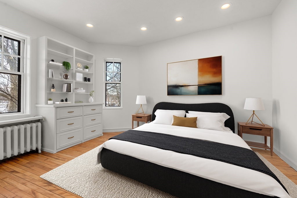 Overlooking the Charles River and Harvard Athletic Fields, this southwest facing home offers many exposures and high ceilings throughout. The foyer has floor-to-ceiling built-in bookshelves and a closet. A 21' living/dining area has a large bay window and brick fireplace. The efficient kitchen provides a gas stove, dishwasher, butcherblock countertops, and access to the back stairwell. The primary bedroom offers 2 closets, built-ins, and direct access to the bathroom. The 2nd bedroom has a bow window, double closet, and built-ins. A tiled hall bathroom has a tub/shower combo. Professionally managed by Thayer & Associates, this well established association has an on-site superintendent and an elevator. The Strathcona-on-the-Charles is truly an ideal location, with immediate access to Riverbend Park and the beloved bike path. Just less than half a mile from the Cambridge Tennis/Skating club, coffee shops, Longfellow Park, JFK Memorial Park, the Harvard Kennedy School, and so much more.