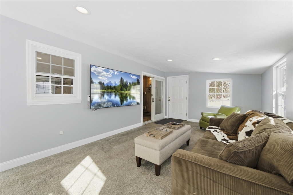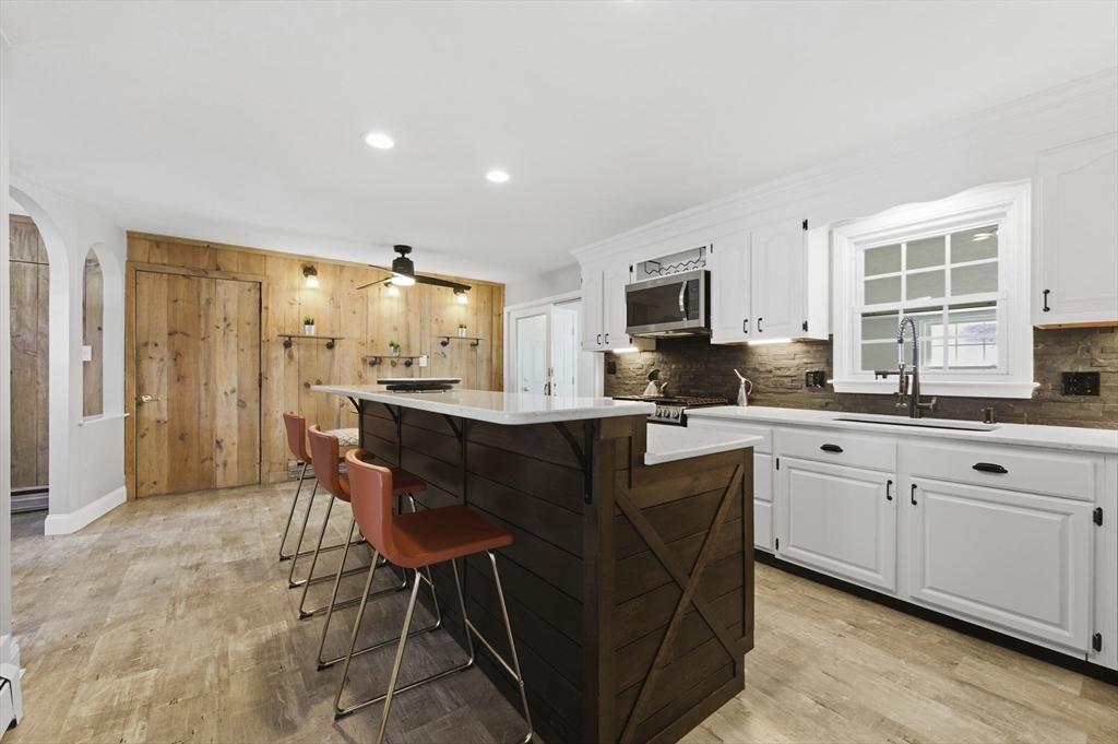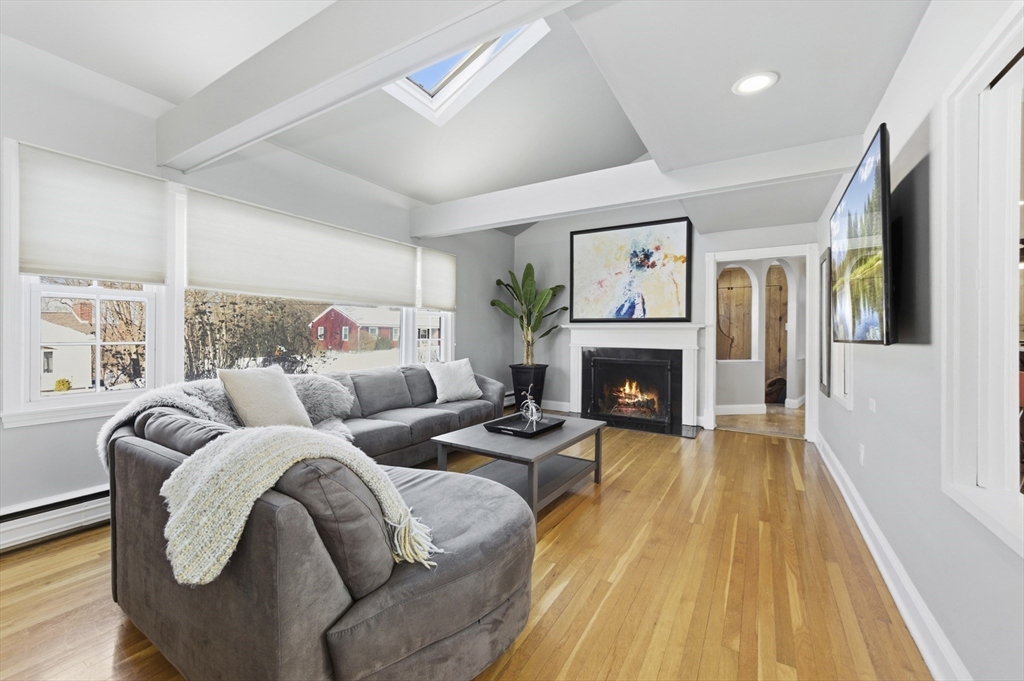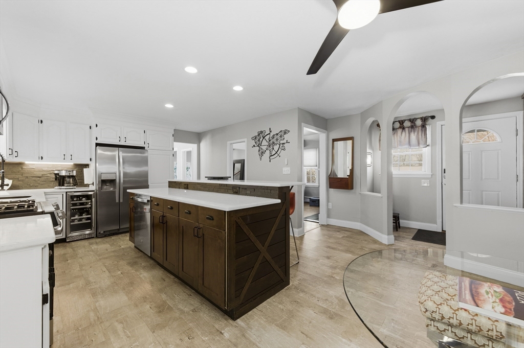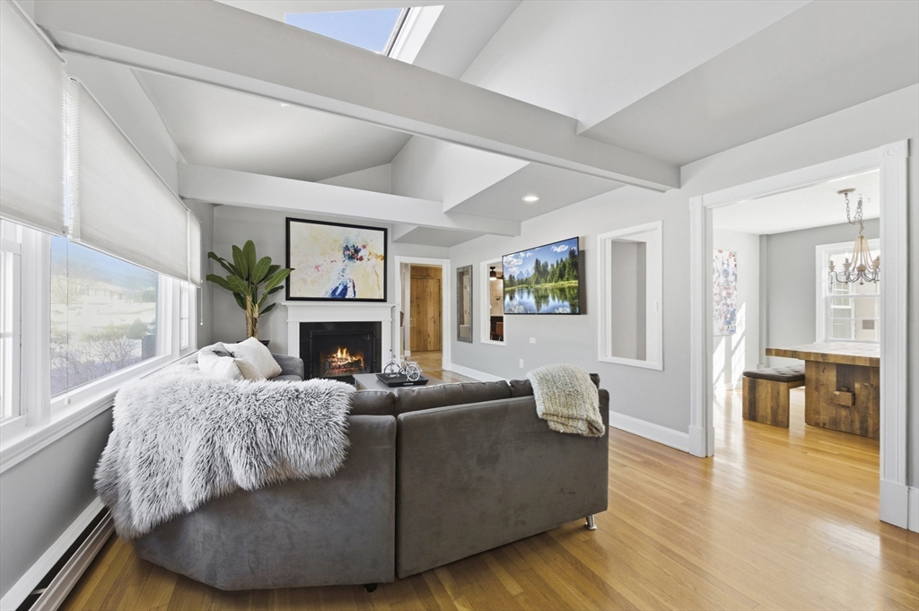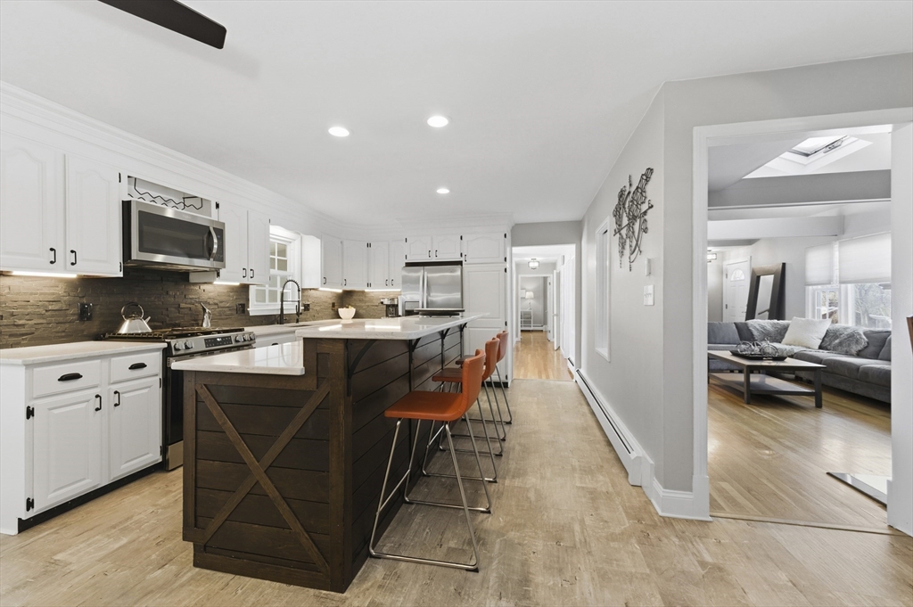 For those who appreciate thoughtful design and true character, this desirable North Tewksbury home offers something special. Inside, a spacious kitchen features an oversized tiered island—perfect for gatherings and everyday living—along with a striking black tile backsplash, quartz counters, stainless steel appliances, and a built-in wine refrigerator. A casual eat-in area and separate dining room provide flexibility for both daily meals and formal occasions. The living room showcases vaulted ceilings, a skylight, and a dramatic fireplace wall. Tucked at the rear, the family room overlooks a beautifully landscaped yard with a paver patio and tiered greenery. The first floor includes a primary bedroom, second bedroom and fully updated bath, while upstairs offers two additional bedrooms and a stylish full bath. The basement provides generous space with room to expand, create a home gym, office, or additional recreation area — plenty of space to grow. This is a must see to appreciate.