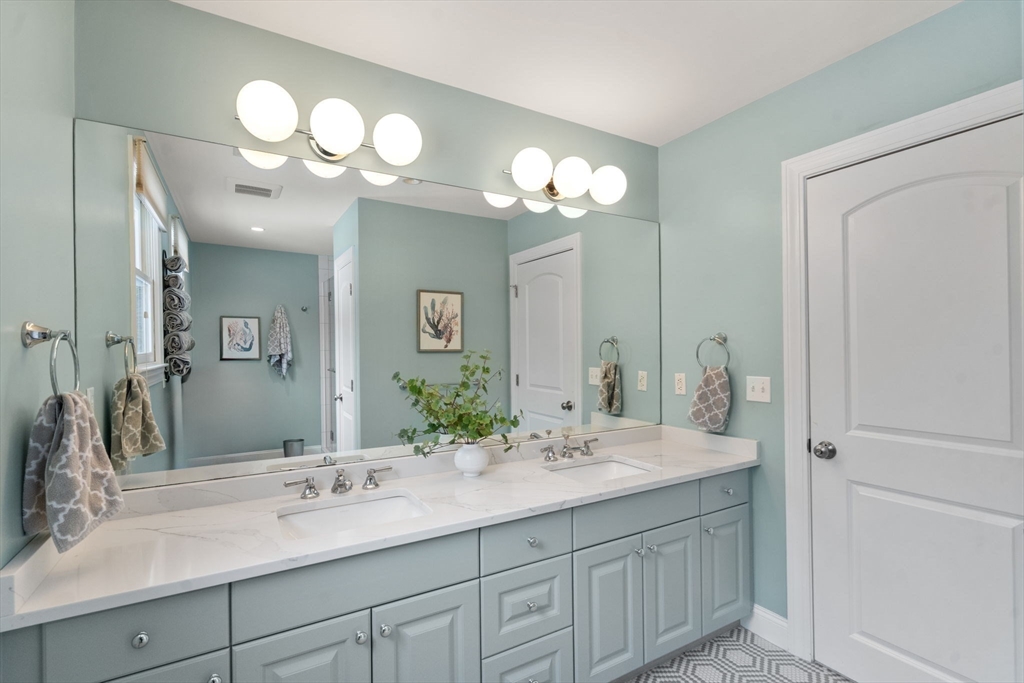 Prime neighborhood location welcomes you into this meticulously maintained, recently updated, move in ready home. Spacious floor plan offers high ceilings, plenty of natural light and neutral decor. Enter the front open foyer to the sitting room with plenty of windows, fireplace and double seating. The dining room is open to the large kitchen that has been renovated with a seated island, plenty of counter, cabinet and storage space. The library/office boasts a built in desk and bookcases. The family room also has builtins. There is a second floor theatre room with bar area, powder room, 3 car garage and access to the patio area and manicured back yard complete with inground heated pool and outdoor kitchen. Second floor is host to the newly renovated primary suite complete with double walkin closet and luxurious bath, three additional bedrooms and new full bath. Finished walkout lower level with full bath and guest room. Great commuter location close to train, hwys and town centers.