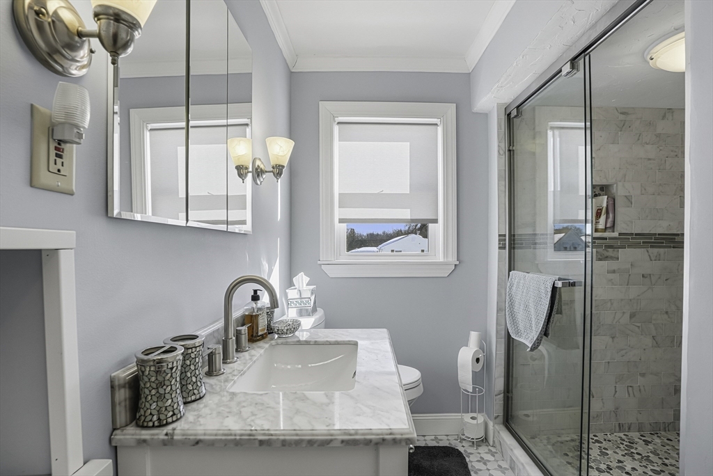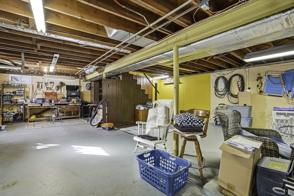Custom Ranch offers a warm and inviting interior and is centrally located in a desirable neighborhood setting, situated on a nice, level lot. The main living area features an open front-to-back kitchen and dining area, along with a comfortable sitting room, formal dining room, and a bright living room highlighted by a picture window. Hardwood flooring runs throughout the main level, which also includes an upgraded bathroom with an oversized tiled shower and marble-top vanity. The lower level provides ample unfinished space ideal for storage or future finishing, but includes a finished bathroom with a shower. Additional amenities include a one-car attached garage, full walk-up attic, rear patio and deck, central air conditioning, generator panel, and SunRun solar for added efficiency.