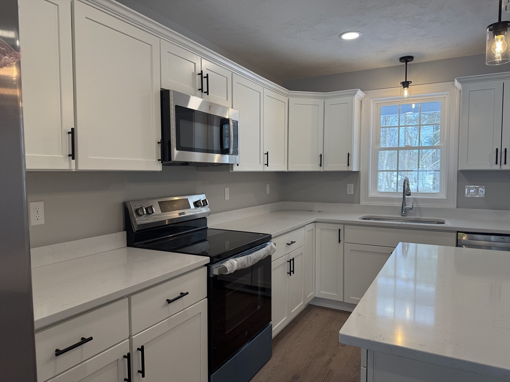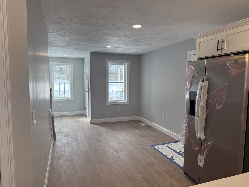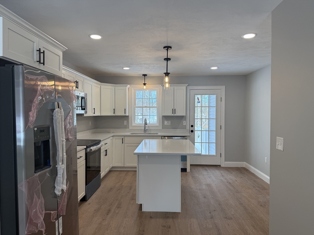 Exciting opportunity to rent a rare, brand-new 4-bedroom condo offering 2,280 sq/ft of beautifully designed living space. This tastefully finished condo features a modern layout ideal for comfortable living and entertaining. The first floor offers a spacious primary bedroom with a private en-suite bath, along with a stunning kitchen featuring crisp white cabinetry, modern black hardware, stainless steel appliances, and a large island with quartz countertops. Ample cabinetry provides excellent storage. Sliding doors off the kitchen lead to a private balcony overlooking manicured lawns, perfect for relaxing or entertaining. A convenient half bath completes the main level. Upstairs are three generously sized bedrooms and a full hallway bath, offering flexible space for guests, family, or a home office. Additional highlights include central air conditioning and low-maintenance living. Ideally located minutes from a highway exit with easy access to Cape Cod, Boston, Plymouth, Etc.