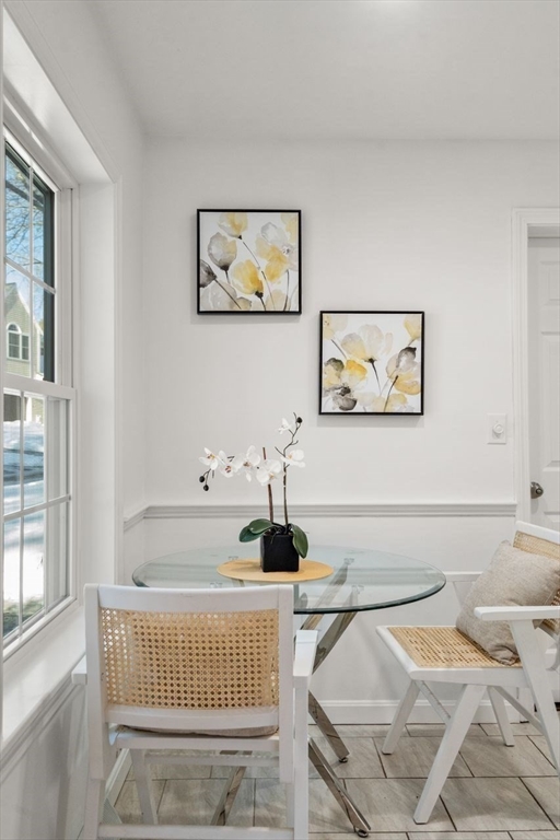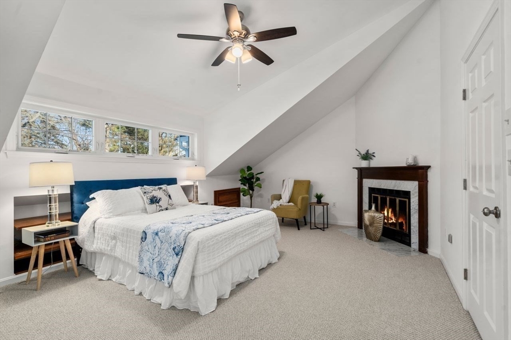 Stunning corner end- unit townhouse with two bedrooms, two full and two half baths on three finished levels at The Gazebo. Offering space, comfort and convenience, this sun-lit home features living room/dining room open floor plan w/ pellet stove fireplace, sliders to private patio overlooking landscaped grounds perfect for relaxing & entertaining. Some recent improvements include renovated bathrooms, freshly painted interior, new carpeting, & fixtures. Eat-in kitchen offers new/newer stainless steel appliances & direct entry garage. Second level has impressive spacious bedrooms; primary w/ built-ins, bathroom, walk-in closet & second bedroom w/wood burning fireplace & vaulted ceiling. The finished lower level adds versatility complete w/ a kitchenette & updated full bathroom, ideal for guests, a home office or additional living space. Enjoy an easy commute to Boston, shops, parks, Burr Elementary School, major routes, commuter rail, express bus & everyday amenities just minutes away!