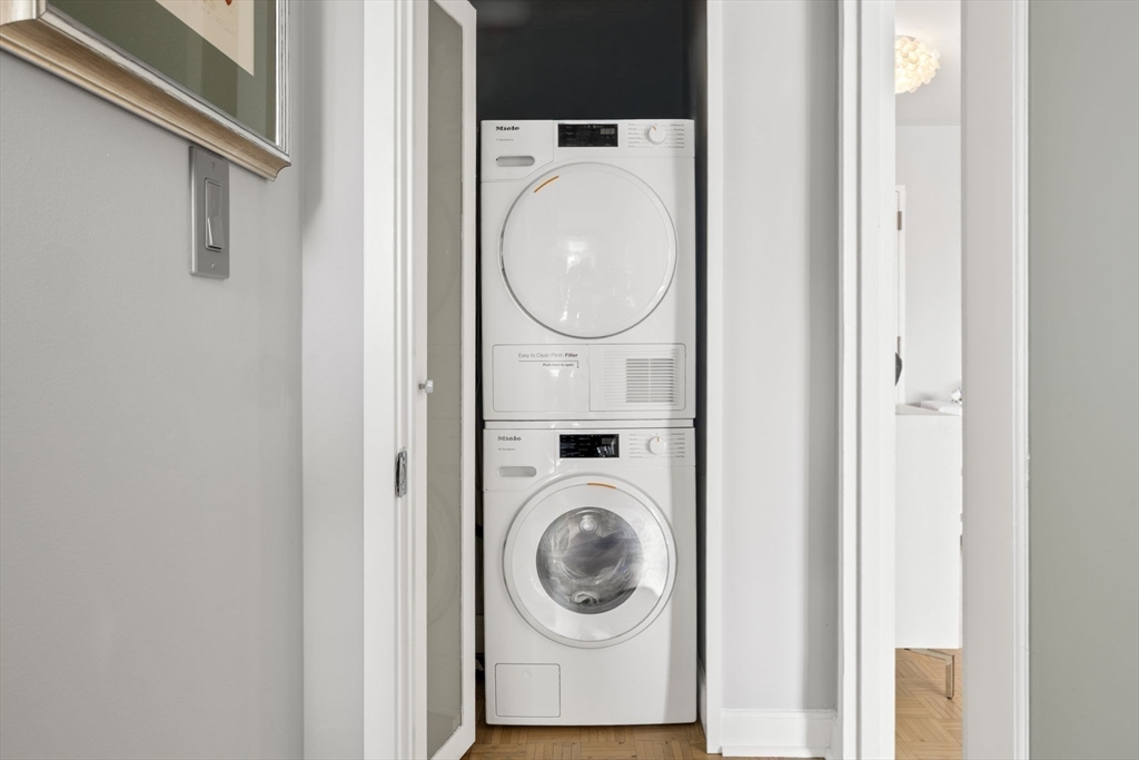 Newly renovated and sun-drenched, this sophisticated 1-bedroom, 1-bath residence offers stunning views of iconic Fenway Park. Meticulously maintained, the home showcases thoughtful upgrades throughout, including smooth ceilings, hardwood floors and fresh designer paint, updated electrical and plumbing systems. All new doors and custom closets. The bathroom has been elegantly refreshed with a new vanity, toilet, and contemporary lighting. The kitchen is both stylish and functional, freshly painted with all-new premium appliances, including a Beko induction range with convection and air-fryer capabilities, Beko dishwasher, GE refrigerator, Samsung microwave, and a new disposal. Additional highlights include custom window treatments, and the rare convenience of an in-unit, stackable Miele washer and dryer. Perfectly positioned with all Kenmore Sq has to offer. Garage parking as well as 24-hour concierge service, on-site property mgmt, A Co-op with real estate taxes included in HOA