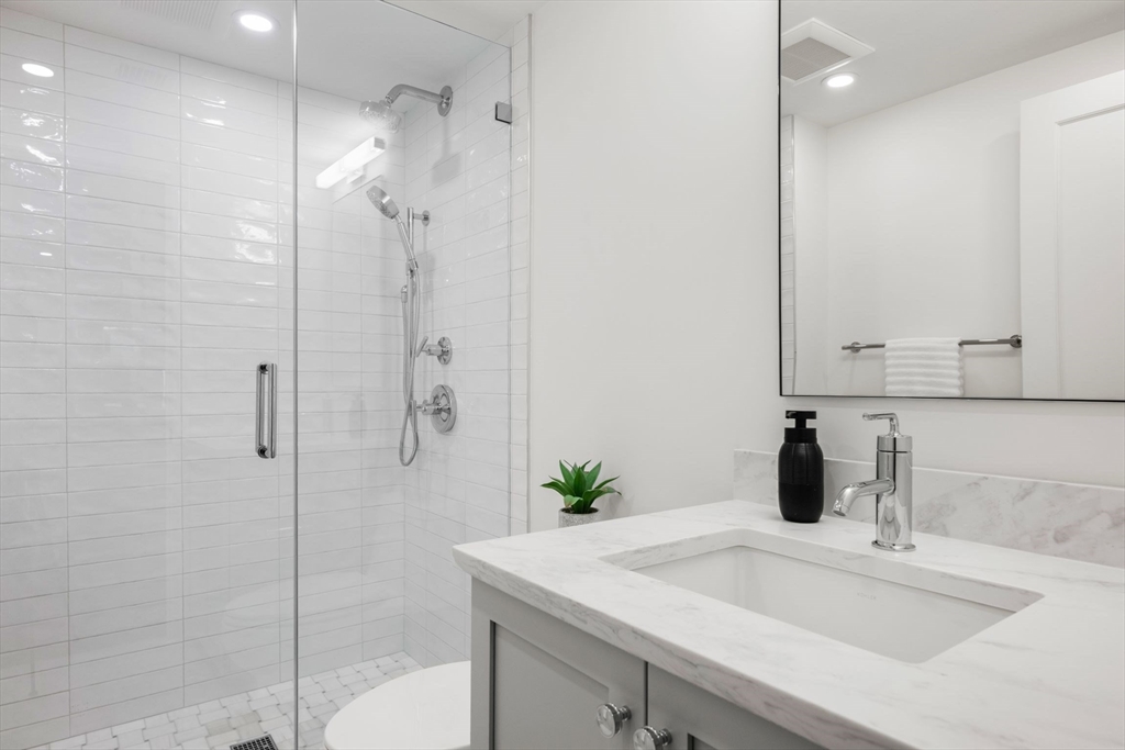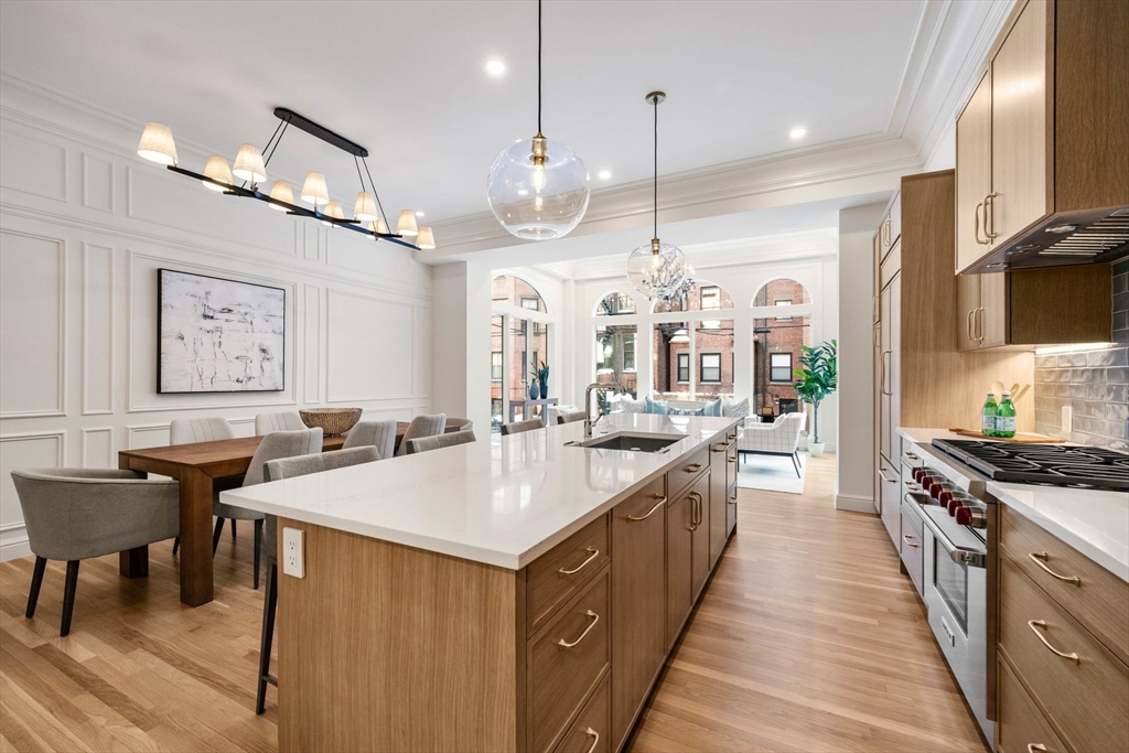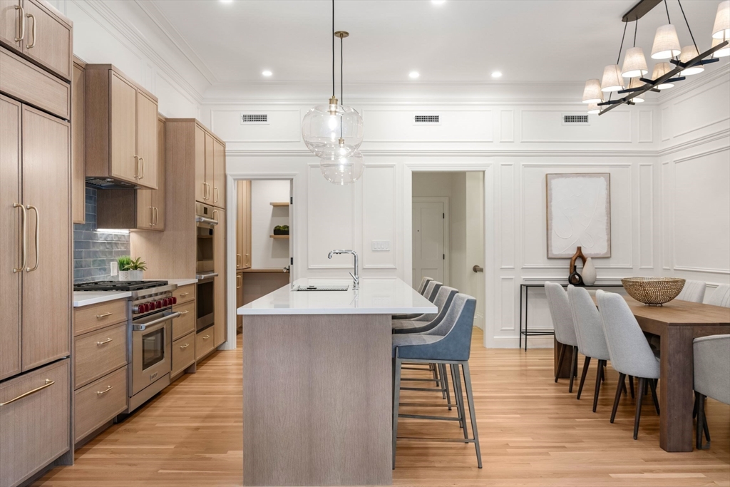 Parlor-level duplex offering 3 bedrooms, 3 baths, and 2,146 sq ft following a complete, no-expense-spared gut renovation. Ceiling heights range from 9–10 feet, soaring to 12 feet in the solarium, which is one of only a handful of true living-room solariums in Back Bay. The home features a newly reconfigured floor plan with all-new plumbing, electrical, Lutron lighting throughout, two-zone HVAC, insulation, roof, doors, flooring, and windows. A dramatic, light-filled solarium living room with custom exterior copper cladding anchors the main living space. The entirely new kitchen is outfitted with a counter-depth Sub-Zero refrigerator, Bosch dishwasher, Wolf 6-burner gas range with double ovens, stone countertops, custom lighting, tile backsplash, cabinetry, vented hood, oversized island, and walk-in pantry. Spa-quality baths feature bespoke tile work and high-end fixtures. Additional highlights include in-unit washer/dryer, storage, and direct access to parking.