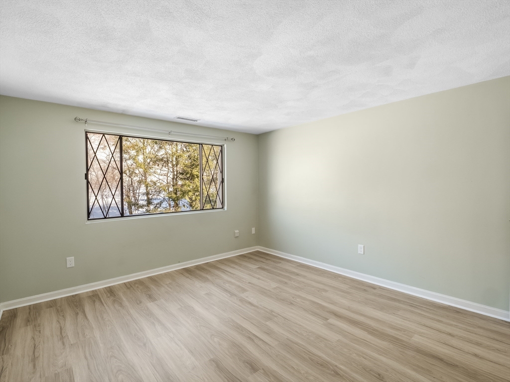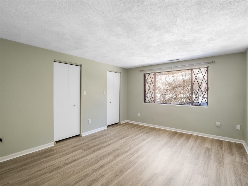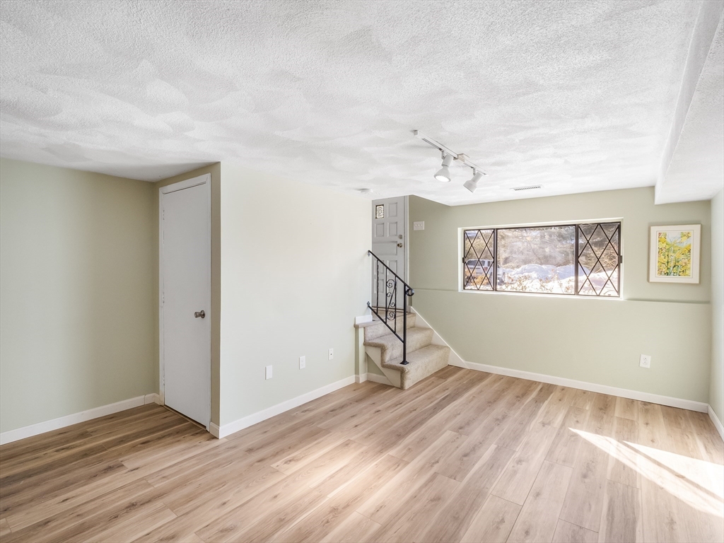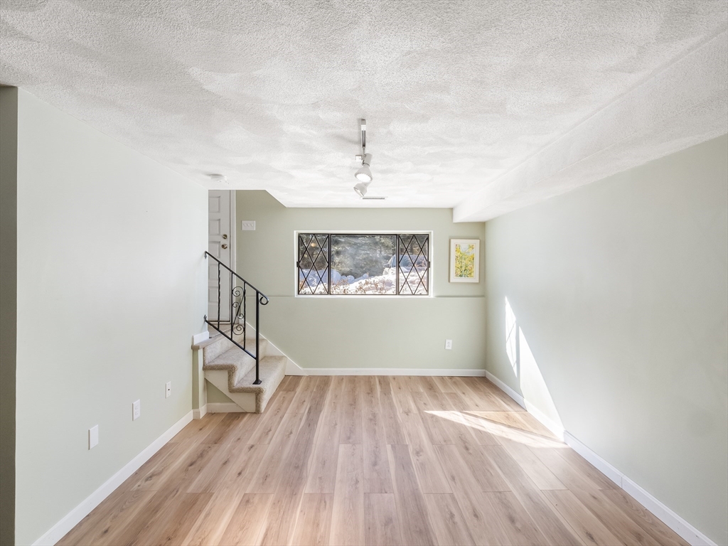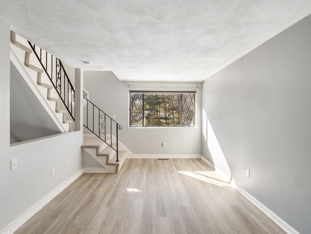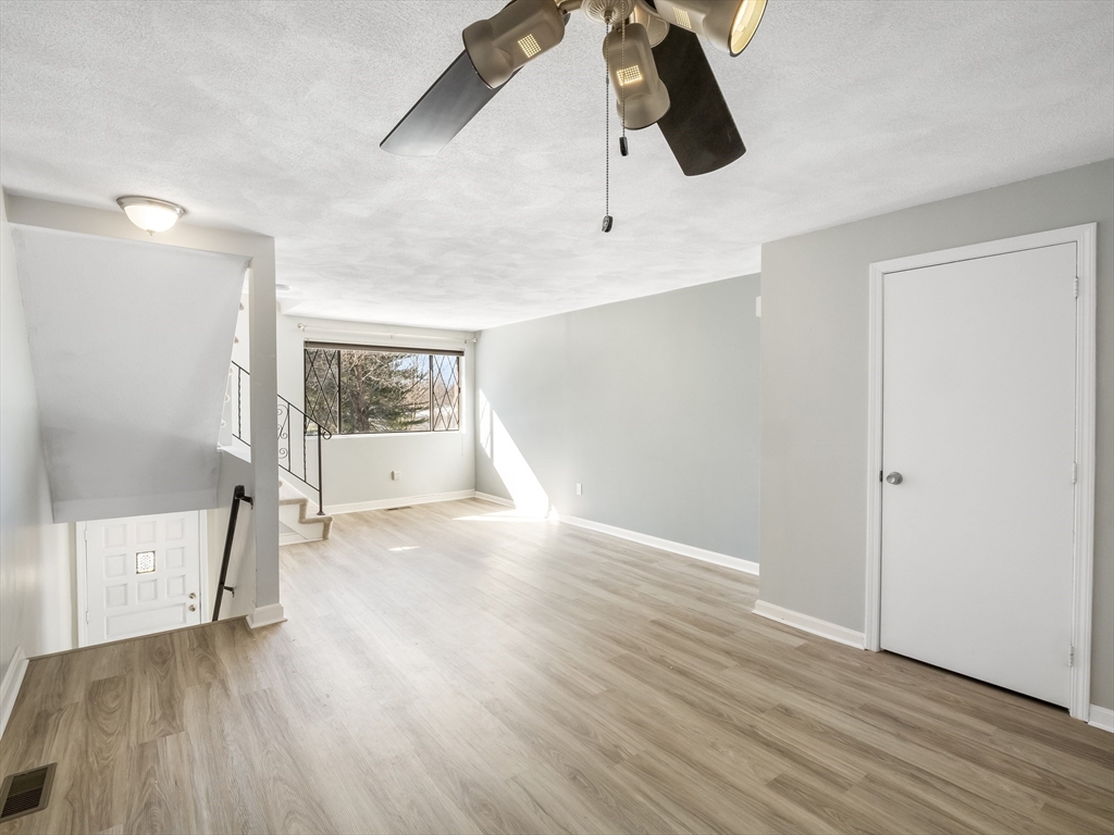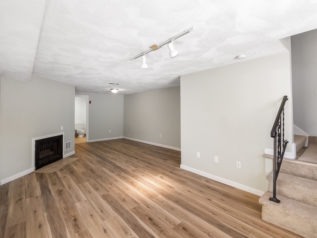 Renovated townhouse ~ freshly painted, new flooring throughout, recently appointed upgrades in kitchen including a new gas stove. This townhome is three floors ~ a few steps to the basement where there is an open living room with a gas fireplace and bathroom and laundry - it's big. Then upstairs on the main floor is another large living/dining & kitchen - all consistent flooring too. The kitchen has been upgraded with a new quartz white countertop, the oak cabinets have been refurbished because they are in good condition and a new gas stove has been installed. There is room for an eat-in dining table or you can put an island in the kitchen depending on what you like. The third floor has two huge bedrooms. In one bedroom there is an enormous closet (walk-in) and in the other comes with two closets. This unit is tucked way back away from the road and looks out to green space. Comes with central air, patio right off the kitchen, and 2 parking spots! Easy to show by appointment.