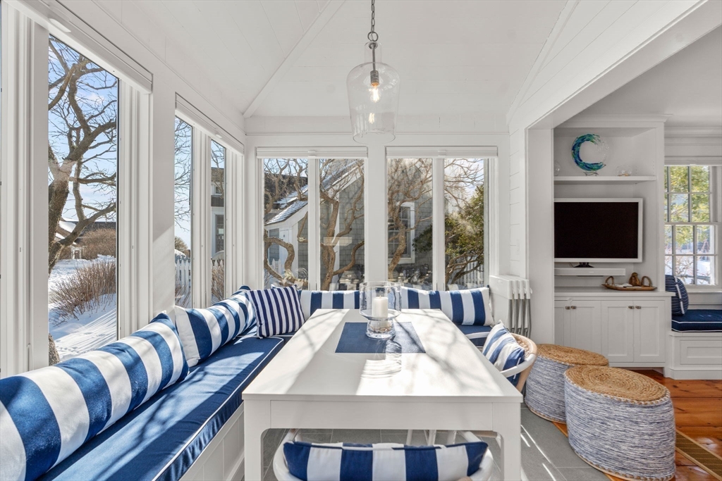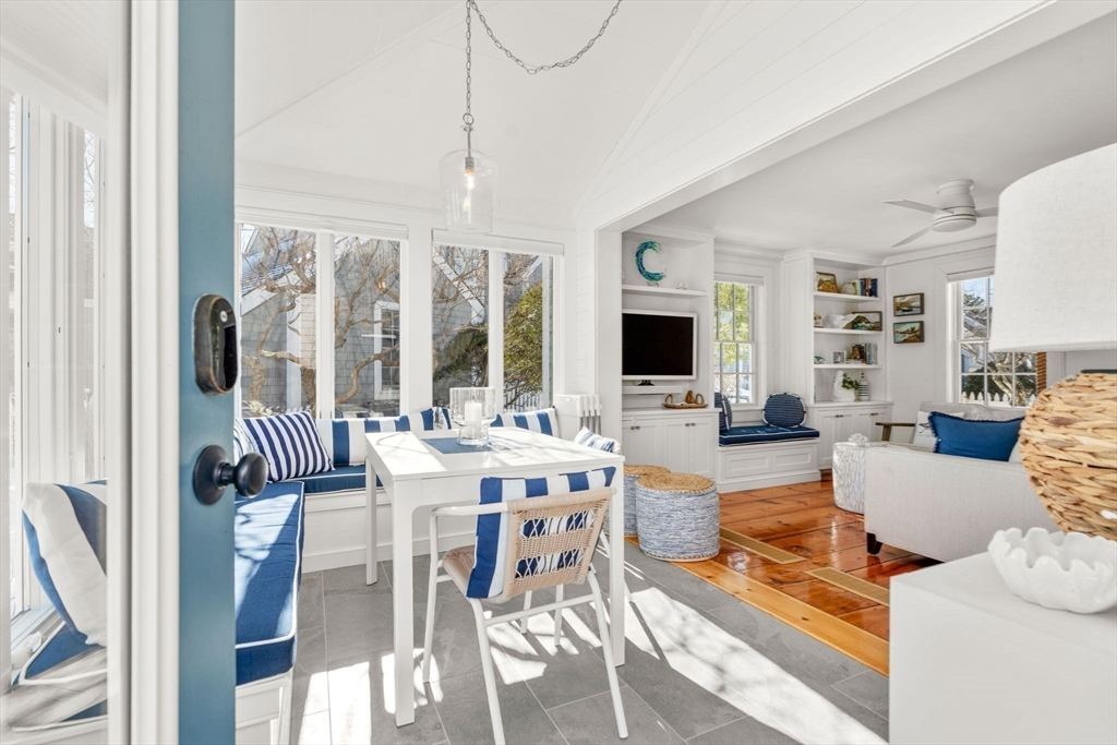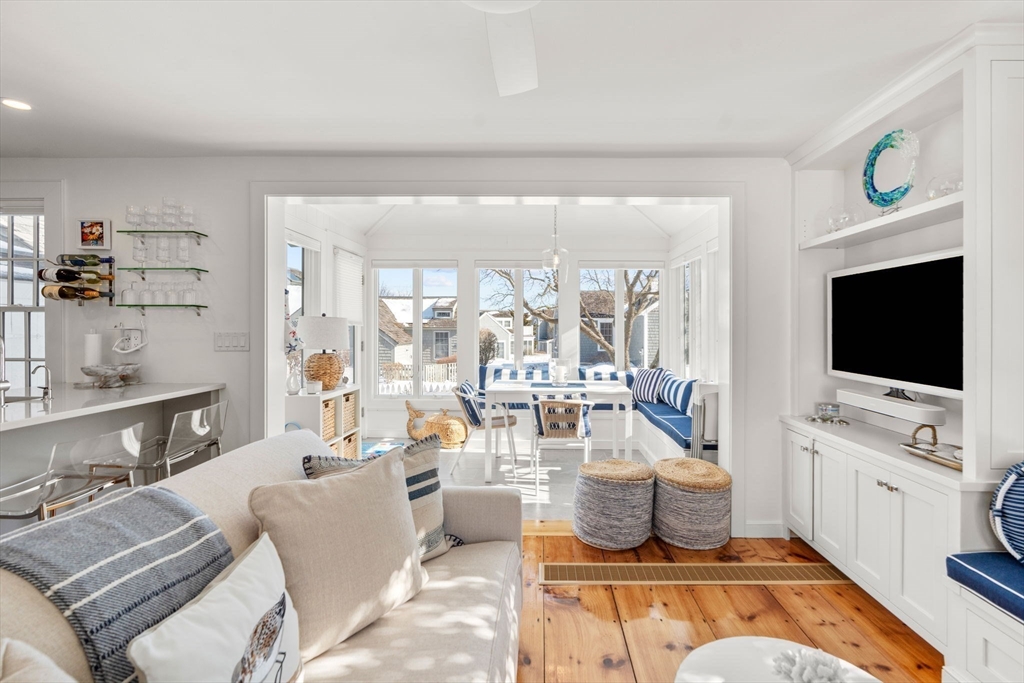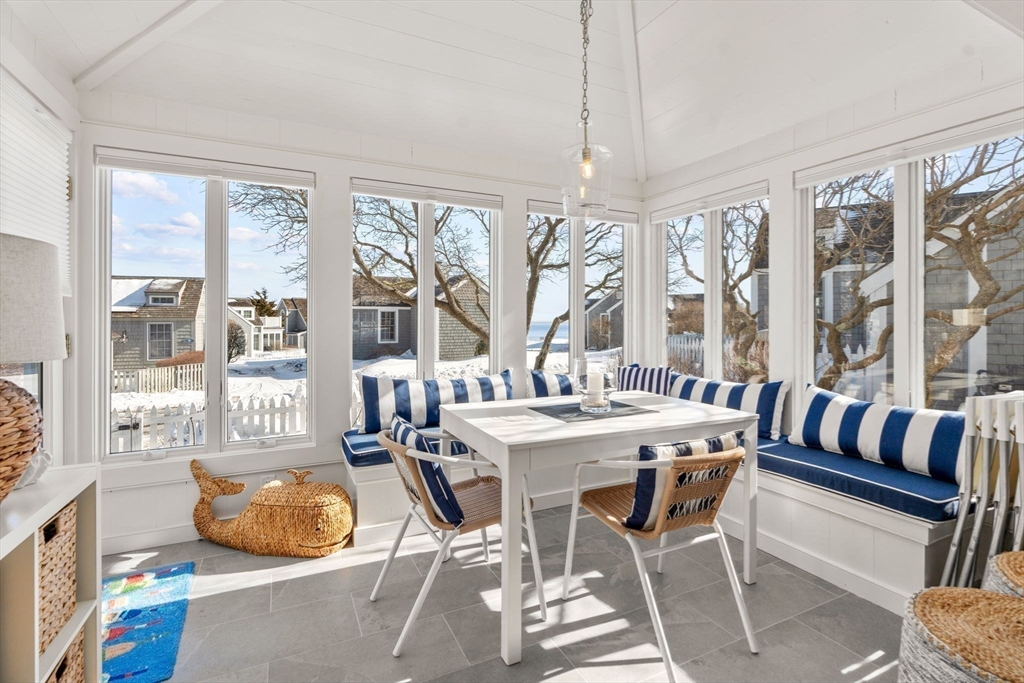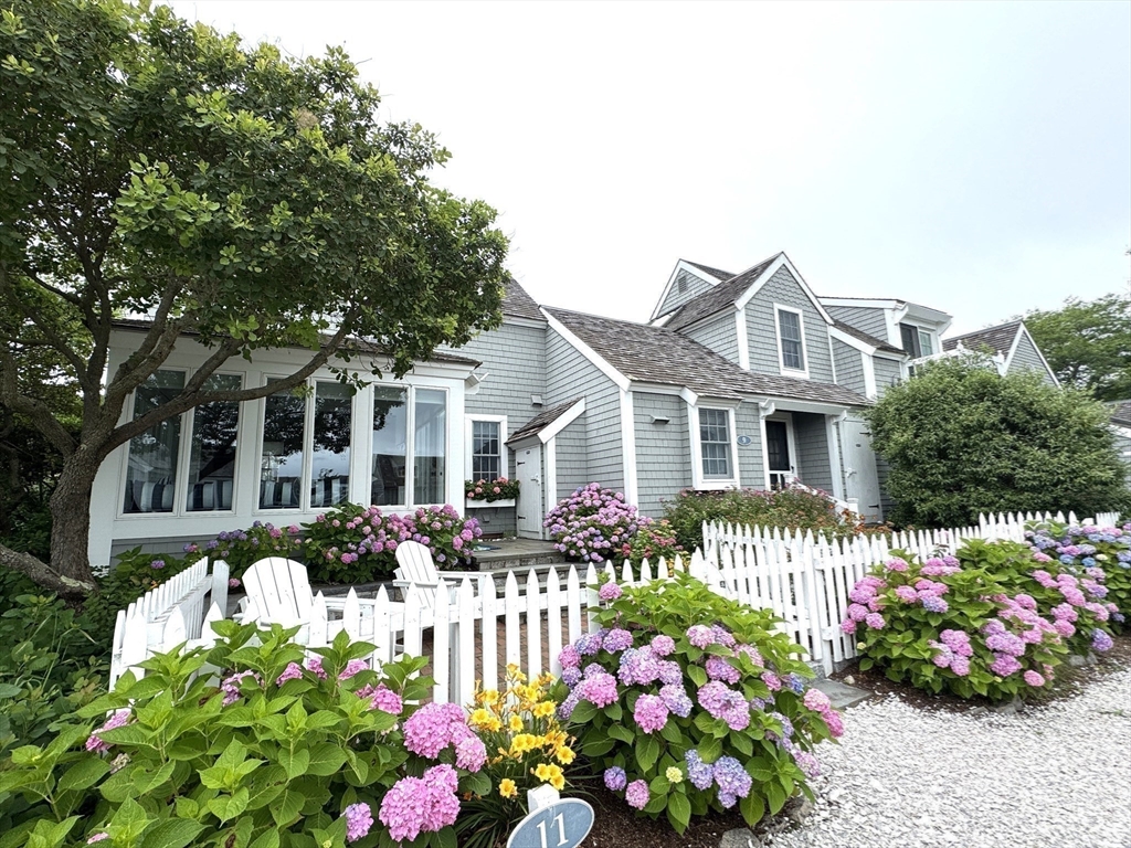 Experience coastal living at its finest in this beautifully updated Nantucket-style condo, set within the coveted oceanfront village of Maushop. This charming retreat offers deeded access to a private sandy beach on Nantucket Sound. Recent upgrades bring comfort and peace of mind, including a new kitchen, updated baths, new heating and air-conditioning systems, and a whole-house water treatment system—all completed within the last few years. Inside, the home feels warm and inviting, featuring a living room with custom built-ins, a sunroom dining area with ocean views, and a full kitchen with bar seating. The second level offers a primary bedroom with ocean views and a spa-inspired full bath with laundry. Beautiful wide-board pine flooring runs throughout. Two outdoor patios provide a serene setting for dining, relaxing, and gathering with friends and family. This ideal location places you moments from the Marketplace shops, the Popponesset Inn, New Seabury Country Club, and miles of wa