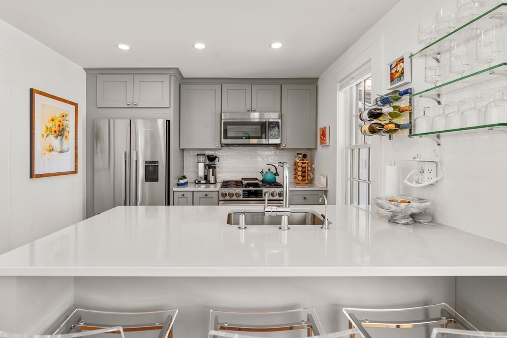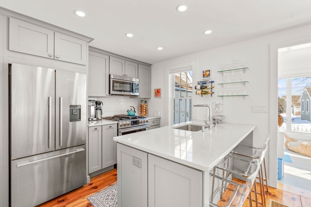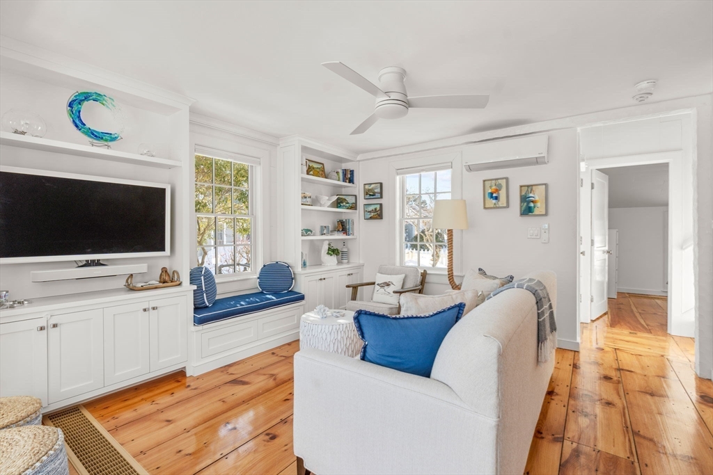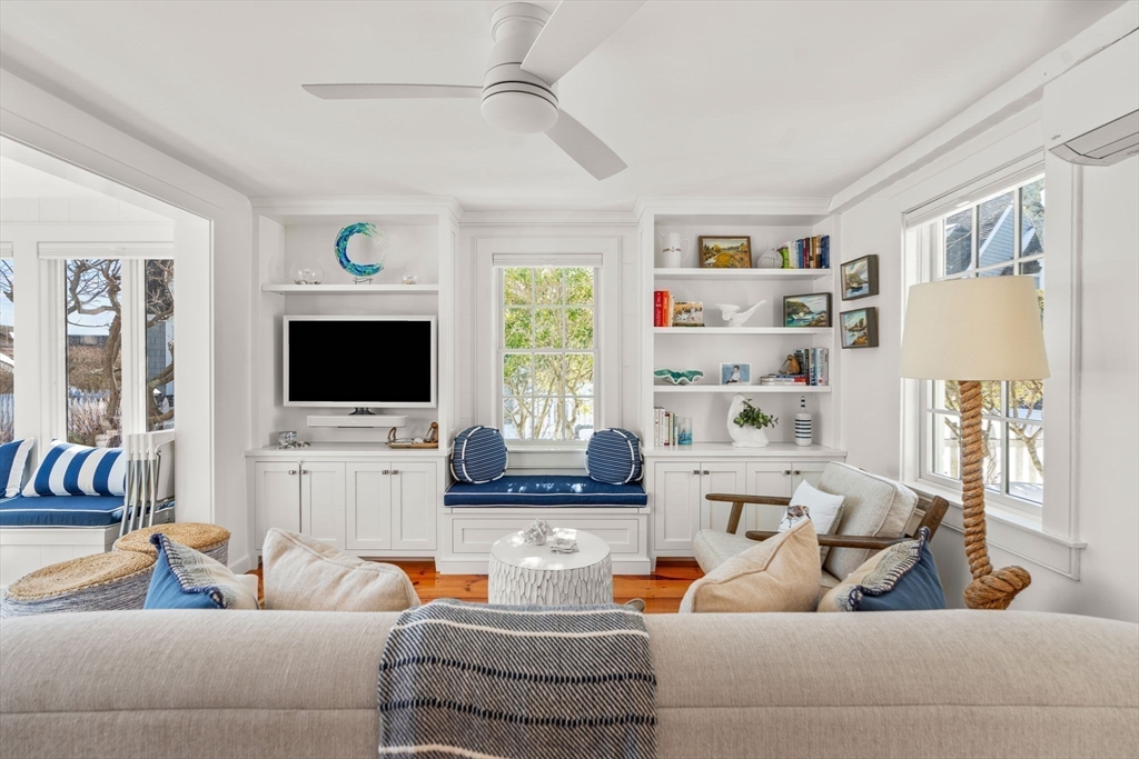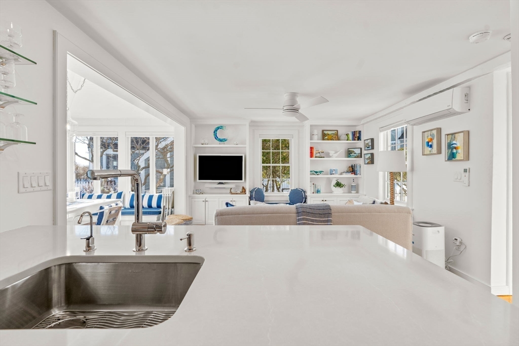 Experience coastal living at its finest in this beautifully updated Nantucket-style condo, set within the coveted oceanfront village of Maushop. This charming retreat offers deeded access to a private sandy beach on Nantucket Sound. Recent upgrades bring comfort and peace of mind, including a new kitchen, updated baths, new heating and air-conditioning systems, and a whole-house water treatment system—all completed within the last few years. Inside, the home feels warm and inviting, featuring a living room with custom built-ins, a sunroom dining area with ocean views, and a full kitchen with bar seating. The second level offers a primary bedroom with ocean views and a spa-inspired full bath with laundry. Beautiful wide-board pine flooring runs throughout. Two outdoor patios provide a serene setting for dining, relaxing, and gathering with friends and family. This ideal location places you moments from the Marketplace shops, the Popponesset Inn, New Seabury Country Club, and miles of wa
