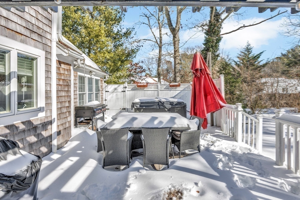 Classic Cape with modern features offering nearly 2,000 sq ft of versatile living space. Enter through the side door into a bright, open den, dining, and kitchen combination designed for easy everyday living. The kitchen features white cabinetry, granite countertops, stainless steel appliances, and a dining area with sliders leading to a spacious wraparound composite deck complete with a pergola and hot tub—perfect for relaxing.The first floor also includes a formal living room highlighted by a whitewashed brick, wood-burning fireplace, along with a convenient first-floor bedroom and a flexible office/laundry room ideal for today’s lifestyle. Upstairs, you’ll find two generously sized front-to-back bedrooms with ample storage and a beautiful hall bath. The finished lower level is ideal for game-day gatherings, hobbies, or additional storage space. No matter your needs, this nearly new, move-in-ready home is waiting for its next owner.All parties to verify the information herein.