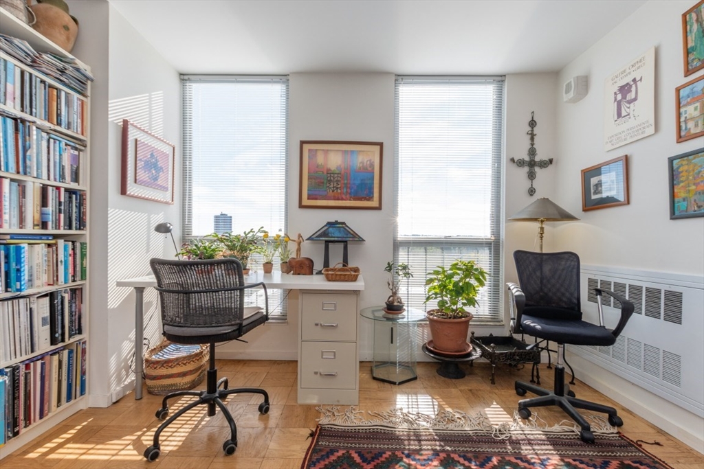 Sundrenched Penthouse! Exceptional residence with south-facing panoramic views and nearly 1,300SF of well designed living space. 2 Bedrooms, 2 Bathrooms, and 2 deeded garage parking spaces. Open-concept living and dining area is highlighted by floor-to-ceiling windows, wood floors, and crown moldings. Updated kitchen features off-white cabinetry, granite counters & stainless steel appliances. Primary suite has double closets plus an additional walk-in closet with custom built-ins and leads to an en-suite bathroom. 2nd bedroom has double closets and two floor-to-ceiling south-facing windows that fill the space with natural light. Residents enjoy a wealth of amenities including a 24-hour concierge, security cameras, a health club with steam and sauna, a heated outdoor pool, tennis and basketball courts, BBQ areas, a WiFi lounge, and an on-site management office. Across from the MBTA Green Line and just moments from the shops & restaurants of Brookline Village & The Longwood Medical Area.