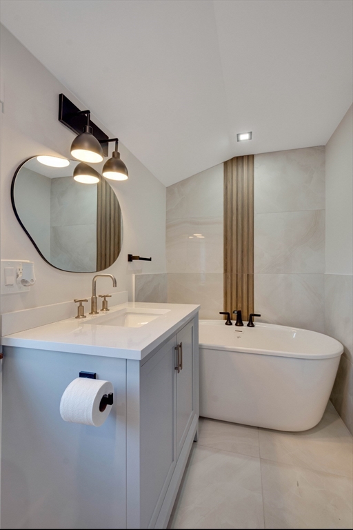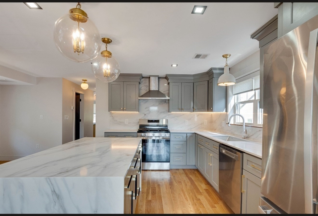 LIVE IN A LUXURIOUS NEWLY CONSTRUCTED APARTMENT IN EXCEPTIONAL LOCATION IN MEDFORD. You will be amazed with the high end quality and detail of this second & third floor Apartment with over 1700 square feet of space, including 3 bedrooms and two full baths. The gourmet kitchen with huge center island & SS appliances. Open floor plan connecting kitchen and family room makes it easy for living and entertaining.On this level is also bedroom with deep custom closets and full tiled bathroom. Dedicated office space perfect for working at home or homework. third level has two large bedrooms and another full bath with custom soaking tub. Dedicated in unit laundry area. High ceilings. Central AC. Large windows & skylights let natural light pour in. Ample closet and storage space. Two porches to enjoy outdoor morning coffee. Zen backyard oasis for enjoyment. Two parking spots in a shared driveway. Dead end street. Quick stroll to Ball Square, MBTA green line, restaurants, pharmacies, and shops.