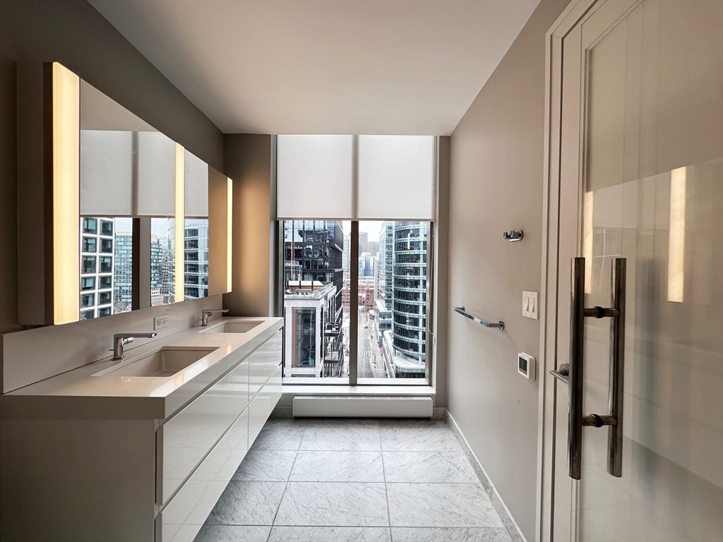 Sophisticated 2BR/2BA residence at Echelon Seaport featuring a desirable split-bedroom layout and floor-to-ceiling windows with expansive city. Open living/dining area with wide-plank flooring and a chef’s kitchen appointed with Thermador integrated appliances, gas cooking, custom cabinetry, and quartz countertops. Spacious primary suite with generous closets and marble bath with double vanity. Well-sized second bedroom ideal for guests or home office. In-unit laundry and one valet garage parking space included. Additional parking is available to rent. Full-service luxury building with 24/7 concierge, doorman, indoor & outdoor pools, fitness center, basketball court, golf simulator, spa, lounges, and landscaped terraces. Prime Seaport location near dining, Harborwalk, major employers, Silver Line & Logan Airport.