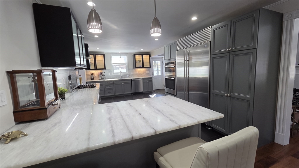 Discover this beautifully renovated and expanded Jason Heights colonial, ideal for both entertaining and comfortable living. The gourmet kitchen features custom cabinetry, marble countertops, and premium appliances. Enjoy a spacious family room/gym with custom eight-foot door panels and sliding glass doors, offering panoramic views of the patio and fenced yard. Four baths, with two on the main level include heated floors and luxurious travertine and marble finishes; a first-floor bath boasts a custom steam shower. The primary suite offers a travertine bath and a private deck. Additional highlights include custom clapboard siding, Anderson A-Series windows, an iron front door with glass inlay, Brazilian cherry floors, and a combined laundry room/butler’s pantry. High-end materials and finishes throughout make this home a unique opportunity in Jason Heights.