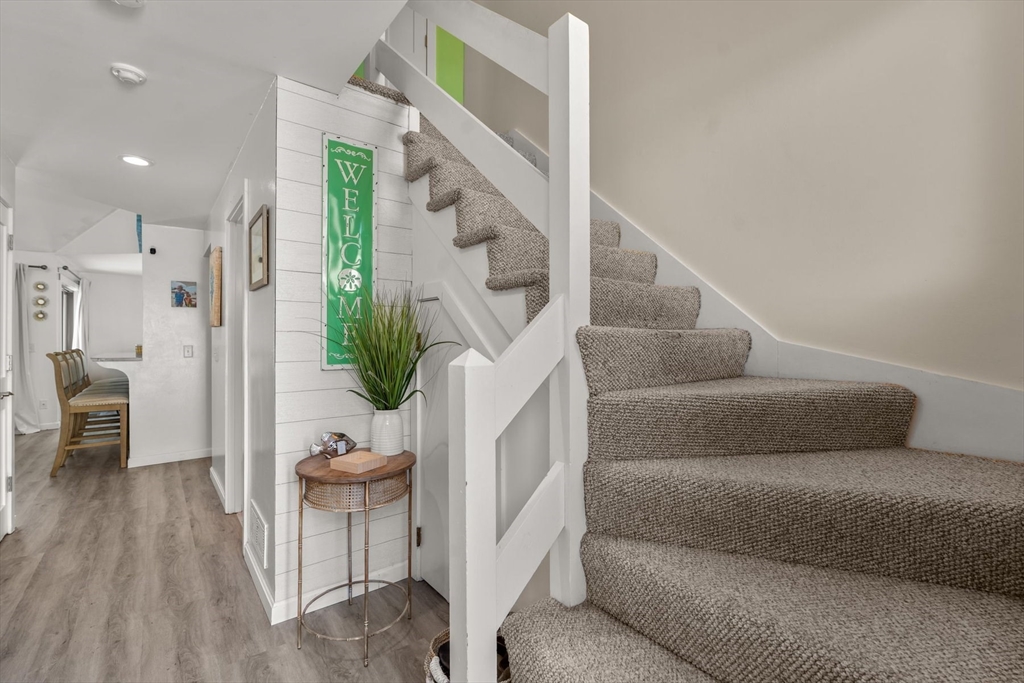 Now is the perfect time to make your move! Enjoy Dunes Course views from this charming two-bedroom condo. This is a great opportunity to own a golf-front corner condominium in On the Knoll section of the Mews in New Seabury. Living room with cathedral ceiling, adjacent dining and updated kitchen. Bedroom and full bath, plus stackable laundry completes the first level. Second floor offers the primary bedroom with large closet, remodeled full bath and balcony overlooking the living room. Living and dining room sliders provide easy access to your private brick patio facing the course. Assigned parking space, plus additional parking for guests. This well-maintained and beautifully landscaped condo complex offers proximity for trails and biking. Located near the Popponesset Marketplace and a few miles from Mashpee Commons for your convenience. Quarterly asssessment of $495 to build reserves. Annual Village fee is $350. Annual membership in community pool is $800.