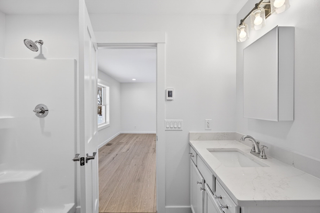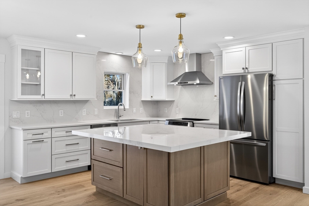 Clean lines, strong flow, and elevated finishes define this newly completed, move-in-ready home in a highly desirable Marstons Mills setting near shops and daily amenities. The three-bedroom, two-bath layout is designed for the way people live, offering openness, natural light, and smart separation of spaces. The entry leads into a spacious great room where living, dining, and kitchen areas connect effortlessly. The kitchen stands out with an oversized miter-edge island, upgraded stainless appliances, custom cabinetry, and quartz counters with a full-height backsplash. Wide-plank white oak flooring adds warmth throughout. Set privately, the primary suite includes a walk-in closet and a spa-like bath with a freestanding soaking tub and separate shower. Two bedrooms share a stylish bath with a full-depth tub. A slider leads to a level backyard, and a deep pour basement with full-depth windows offers future expansion potential. Turnkey, thoughtfully composed, and rare in this price range!