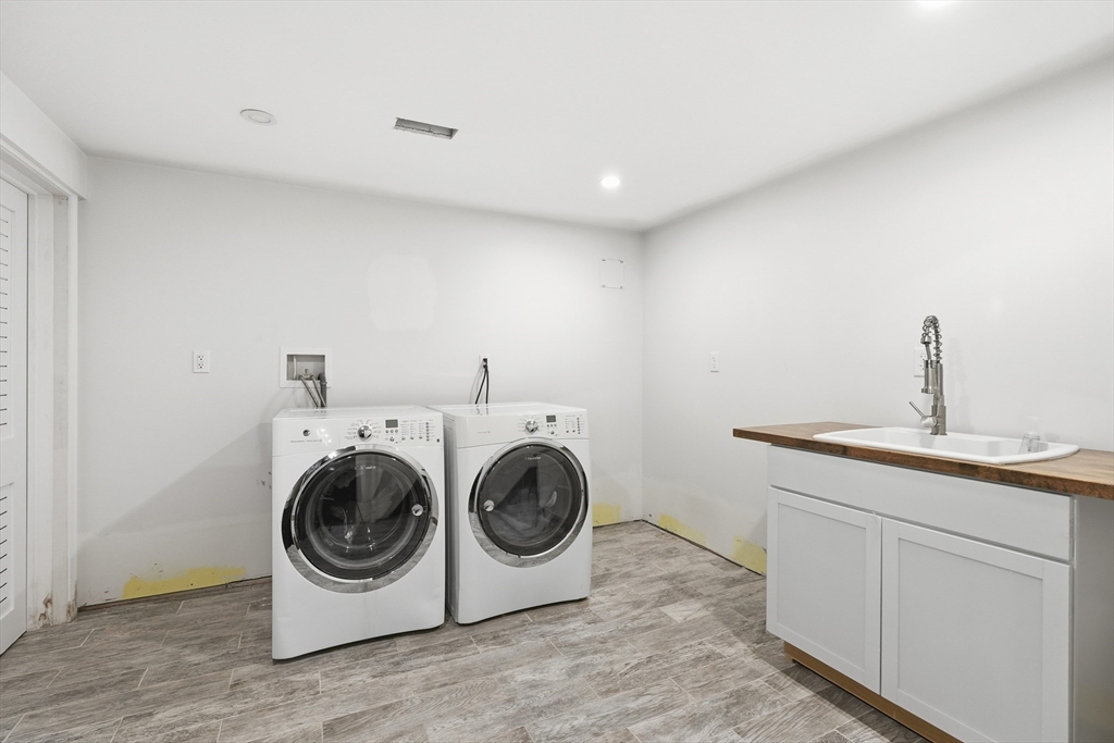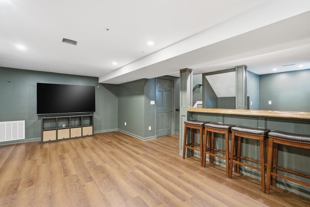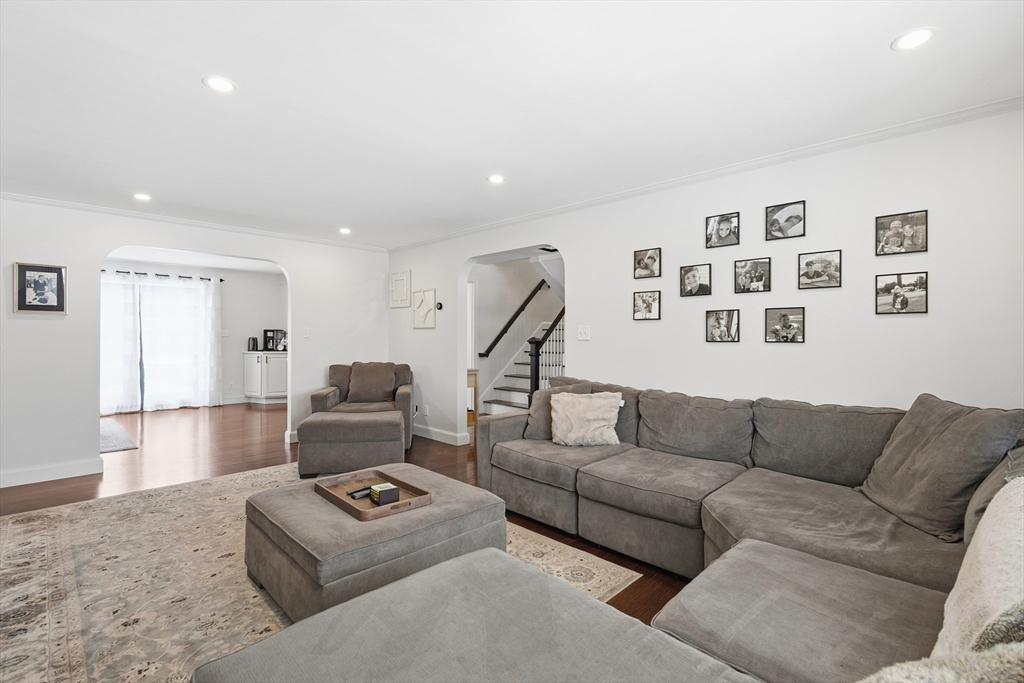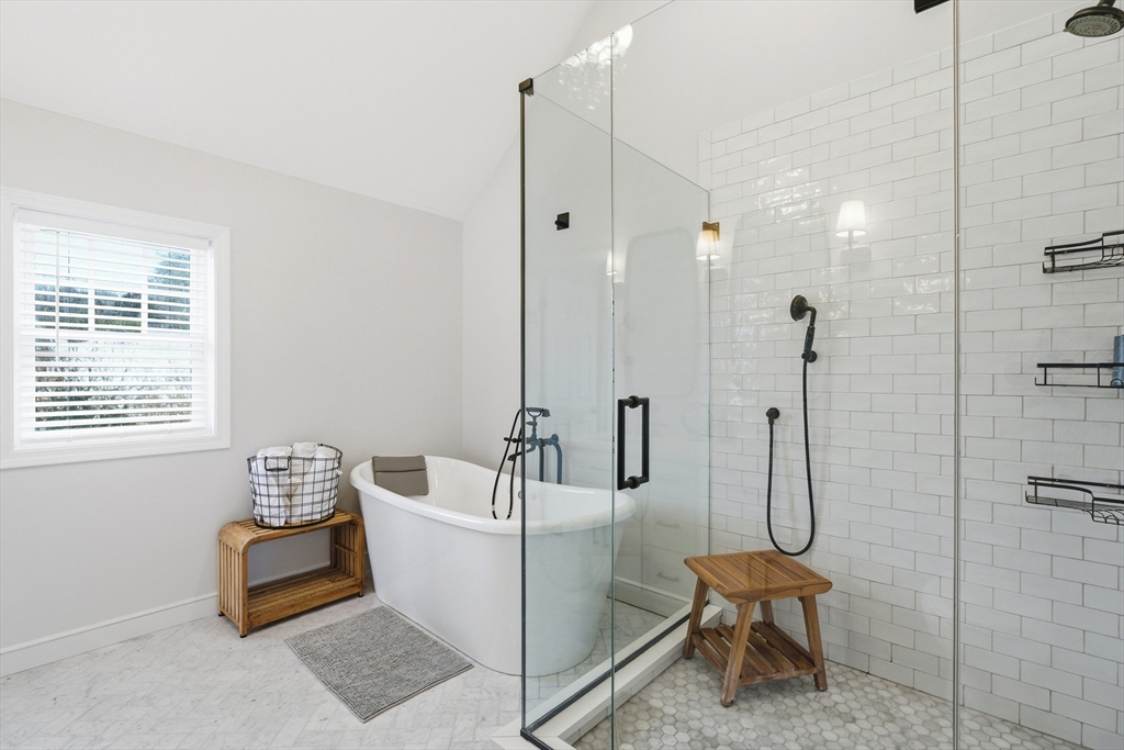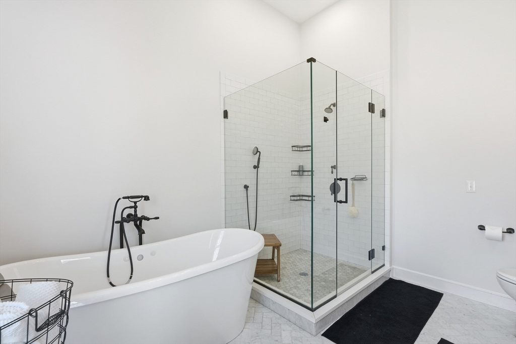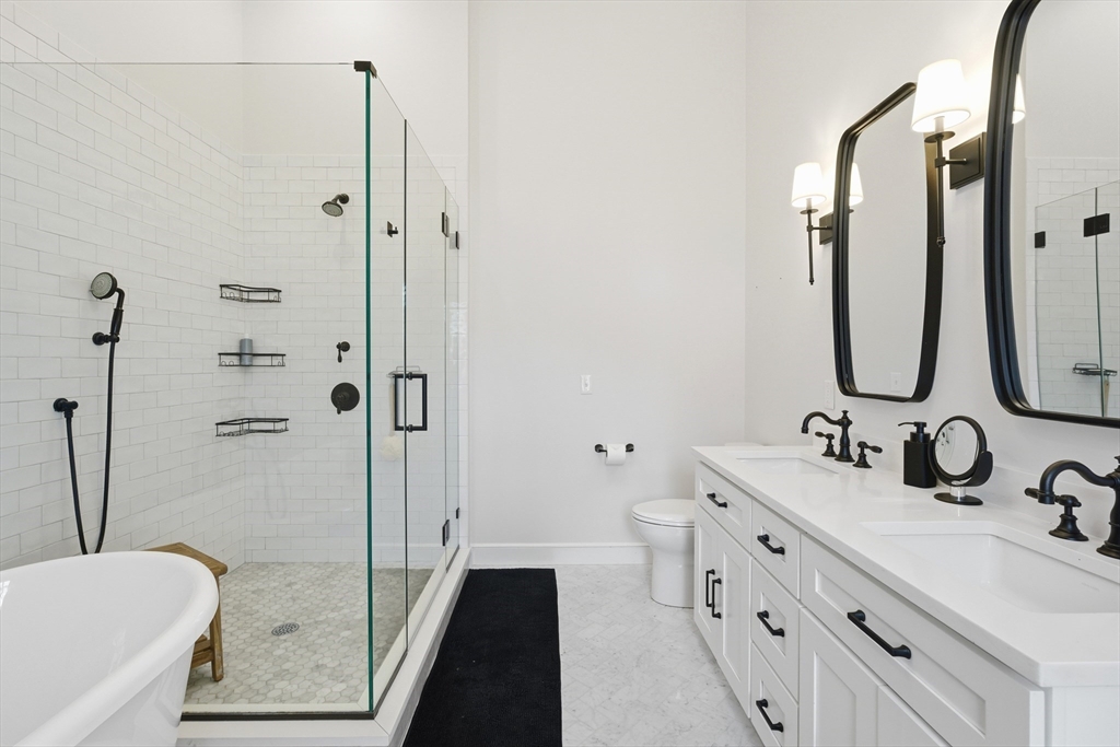 Set on a prominent corner lot in Milton, this turnkey residence blends classic Garrison architecture with elevated modern design. Renovated in 2020, it features Hardie Board siding, a new roof, underground electrical service, updated plumbing, and a Navien on-demand water heater. The kitchen is crafted for both everyday living and entertaining, offering quartz countertops, a gas cooktop, double ovens, and custom cabinetry. Each bedroom enjoys direct bath access, including a luxurious primary suite with heated marble floors, dual vanities, an oversized shower, two walk-in closets, and a private roof deck. A top-level family or game room adds flexibility, while the finished lower level includes a wet bar and full bath ideal for media, guests, or fitness. Three-zone gas HVAC, composite decking, an outdoor gas line for grilling, a lofted garage with mudroom access, and mature arborvitae privacy create a home you will truly love.