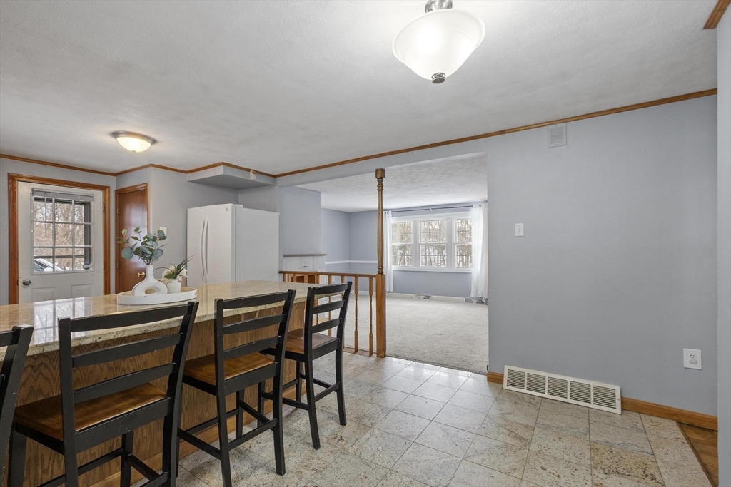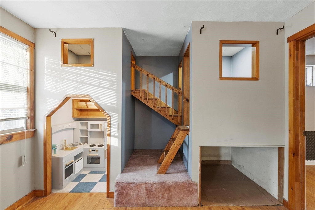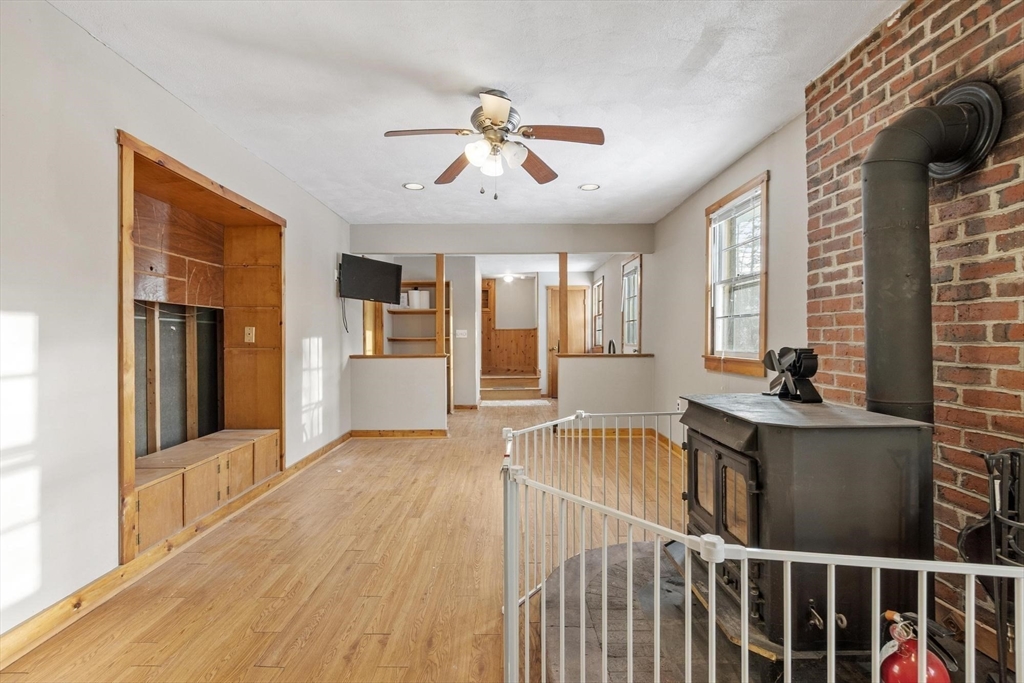 Move right into this 3 bed, 1 bath home featuring an open floor plan & flexible living space just minutes to schools, downtown & it's restaurants, entertainment, shopping, walking trails. The centrally located kitchen offers a large peninsula w/ breakfast bar & direct exterior access for seamless everyday living and entertaining. Bedrooms feature hardwood floors, including one w/ built-in bookshelves ideal for a home office if a third bedroom is not needed. The sunny, spacious living room includes w/w carpet w/ HW under. The finished walk-out lower level delivers exceptional bonus space w/ a cozy family room w/ wood stove & built-in play fort, recreation room, workshop, laundry, utility closet, and added built-in storage throughout. Enjoy the fenced yard for gatherings or pets. Updates include nest thermostat, roof 2018, Mass Save insulation, updated LR & nursery windows, & new dishwasher 2025. Seller states H/W floors under the living room carpet and possibly under the kitchen tile.
