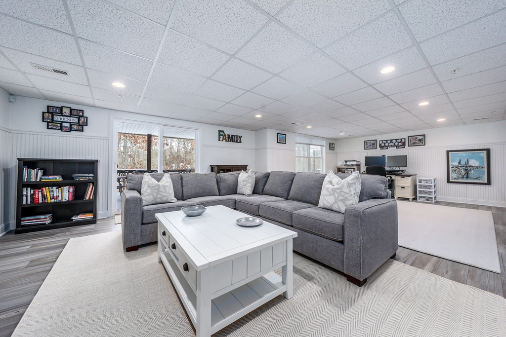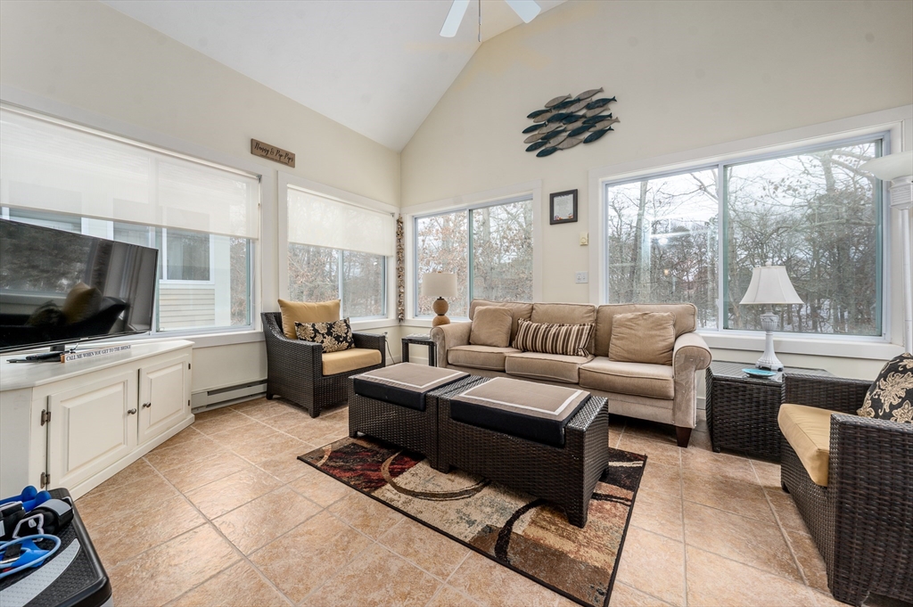 Coveted 55+ Southport Community - Popular Centerville design overlooking Martha's Pond. Features include dramatic great room w/ recessed lighting, gas fireplace, custom built-ins & wood flooring and 4-Season sunroom. Kitchen has stainless appliances, upgraded cabinetry, granite counters & breakfast bar. A spacious primary suite includes private bath & walk in closet. The guest bedroom, 2nd full bath & laundry room complete the main floor. Downstairs offers additional 1300sq' of living space. Newly carpeted family room w/ tasteful bead board wainscoting opens to your private deck. The 2nd room is perfect for extra guests or home office. A full bath, walk in closet & storage area complete the lower level. Southport amenities include a 9 hole golf course, tennis/pickleball courts, heated indoor & outdoor pools & 32,000 sq.' Village Center w/ an array of activities. Buyers pay $4500 fee to HOA at closing.1 pet under 35#, electric grills only. Buyers/Agents to verify all information herein.