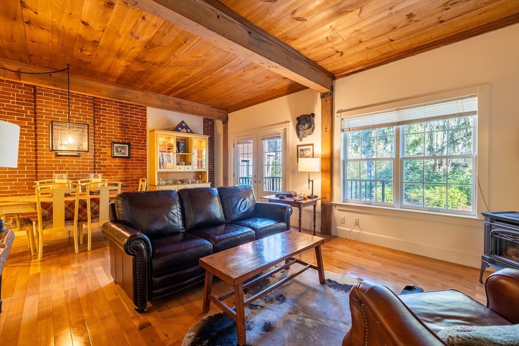 Welcome to Benjamin Chase Mil — where historic charm meets modern comfort. This gorgeous, well-kept SINGLE-LEVEL unit offers WATER VIEWS & the perfect blend of character, convenience, and serenity. Enjoy tranquil stream views from your private deck and living room, creating an inviting space to unwind. The interior showcases exposed brick, original beams, and picturesque wood ceilings that highlight the building’s rich mil heritage. The restoration of this former woodworking mil was masterfully completed, preserving the canal that channels Beaver Brook through the beautifully landscaped grounds. Inside, you’l find warm wood flooring, granite counters, stainless-steel appliances, in-unit laundry, and central A/C for year-round comfort. A RARE ONE-CAR GARAGE adds ease and value. The association features serene common areas with two charming gazebos and direct access to the scenic Beaver Brook Walking Trail — ideal for peaceful strolls. Condo Fee is approximately $324/month.