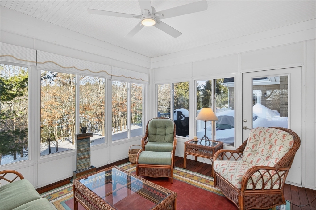 Simply beautiful "Stirling" floorplan located in the Seton Highlands 55+ neighborhood at The Pinehills. The first floor is perfect. From the gourmet kitchen with Thermador stove, hood that vents out, insta hot at the sink, and 7 foot island - you will love cooking for the ones you love. The 1st floor primary suite with walk in closet, spa like bath & exterior access to your deck. 1st floor office w/built in bookcases & french doors located just off the kitchen. The magnificent cathedral ceiling in the living room let’s all the light stream in and when it is a tad bit warmer a lovely 3 season room to be enjoyed. Everything on the first floor! Upstairs there is a second bedroom with bath and loft area. Amazing attic space that could be finished. Lower level is a walkout also filled with light Plenty of room for crafts or a secondary gathering place with electric fireplace. Plumbing has been roughed in for future bath. HVAC replaced Dec 2019. 8 foot garage doors! Radon Sys in place.