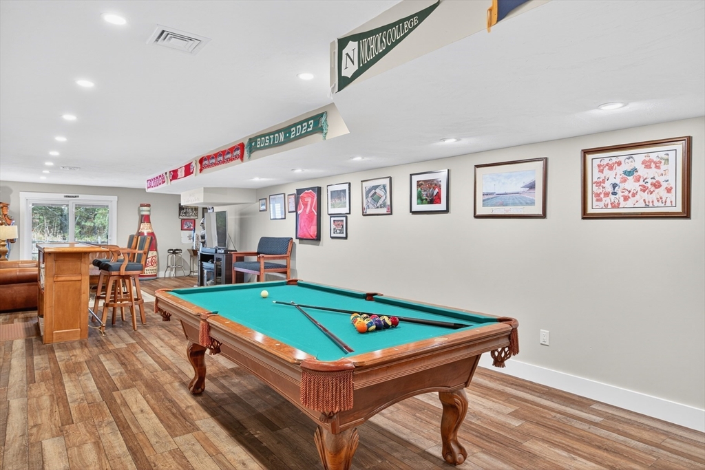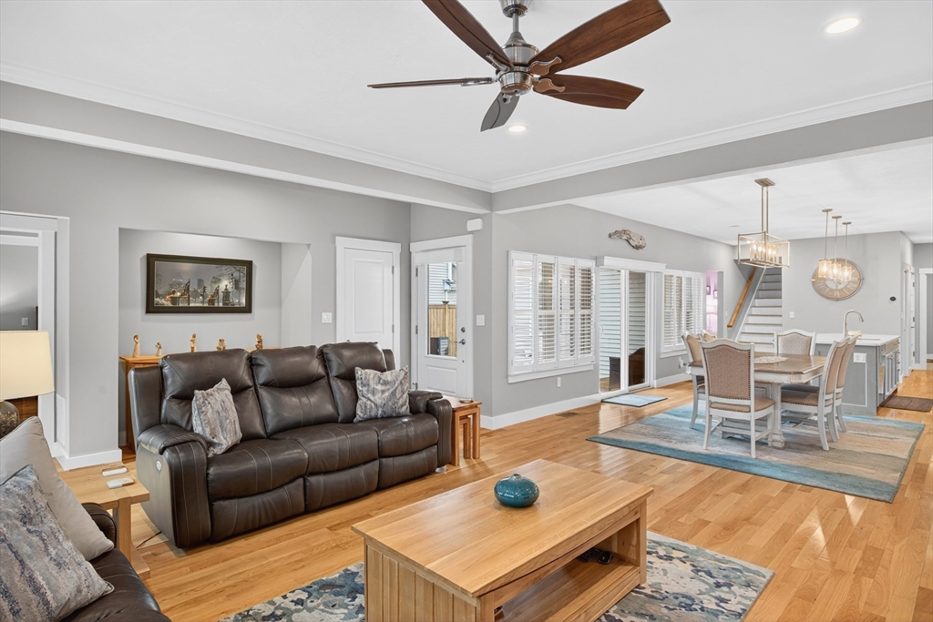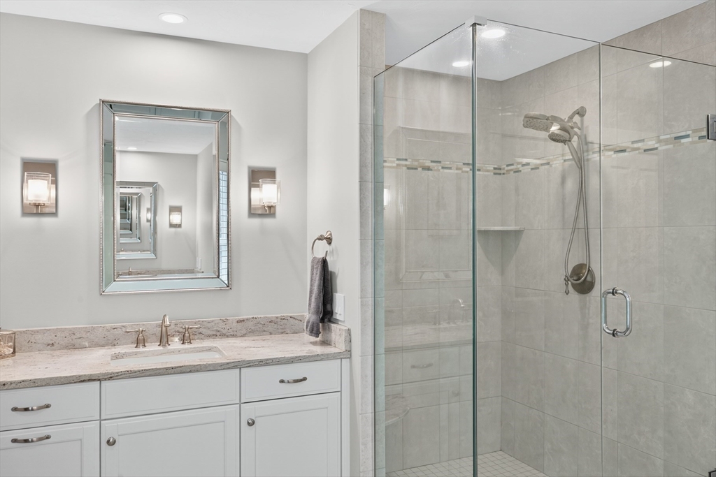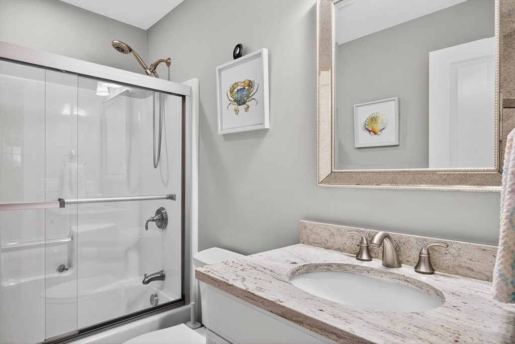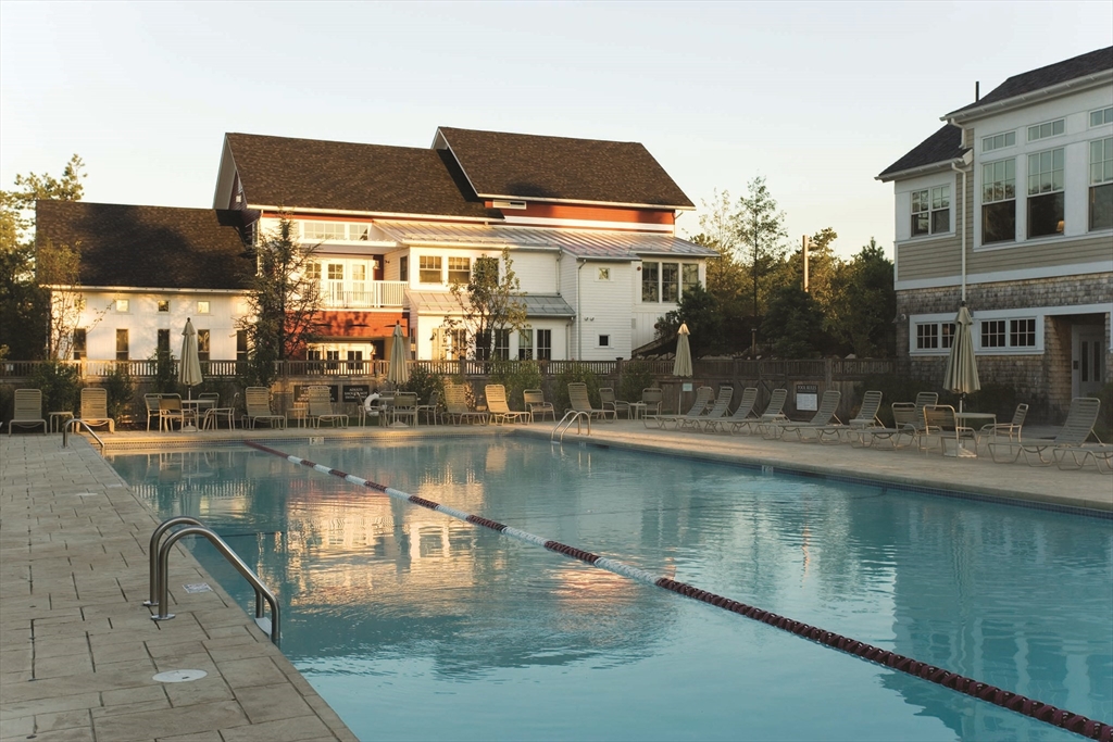 Spectacular and pristine "Fresco 3" style home in sought after Chadwick Corner in The Pinehills. An enchanting private courtyard with a covered porch leads you to the front door and side slider. This open floor plan with custom window treatments and hardwood floors throughout the main floor living space includes a living room with a gas fireplace, dining room, an upgraded kitchen with custom cabinets, quartz countertops and large pantry. A private primary suite on the first floor with 2 spacious closets, double vanities & dressing areas highlighted by the custom tiled shower. A guest bedroom, a full bath, a laundry room and a back deck complete the first floor. The second level has a loft office/den with 3rd bedroom and full bath. Be sure not to miss the wonderfully finished lower level with luxury vinyl planking, with abundant storage, and slider access to backyard. Recessed lighting throughout. The HOA includes The Stonebridge Club pool, clubhouse, gym + tennis courts, and much more!