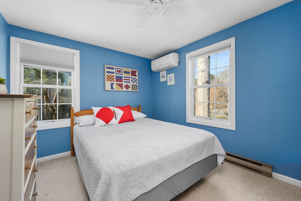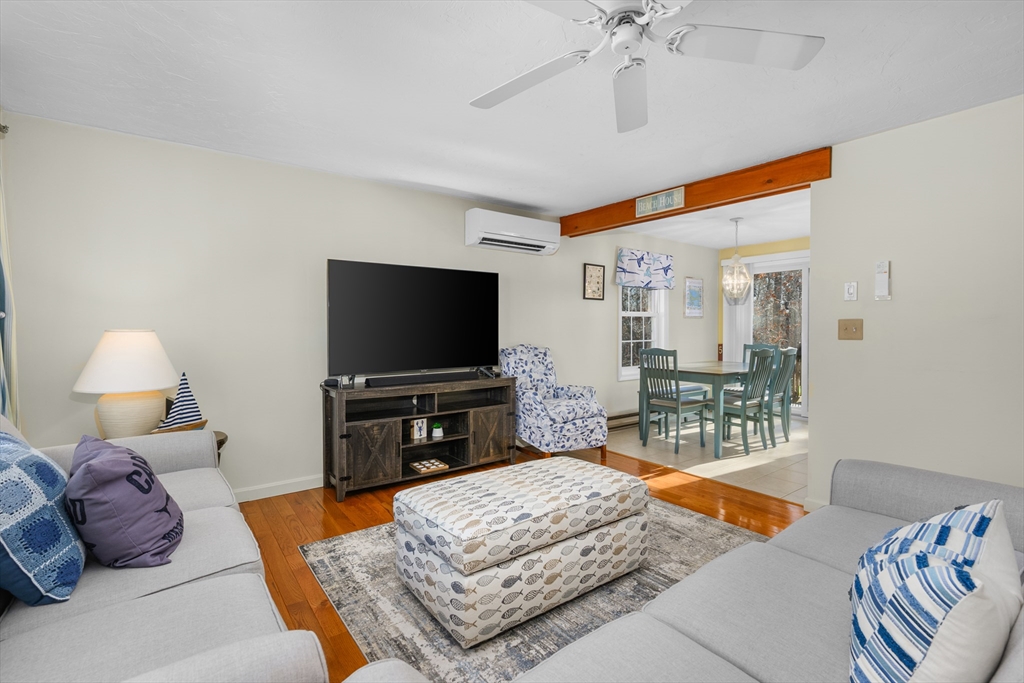 Charming ranch nestled in a delightful cul-de-sac neighborhood, perfect for year-round living or a seasonal getaway. Designed for easy one-floor living, this home features an open living and dining area leading to a deck for outdoor dining, an updated white cabinetry kitchen, a primary bedroom with a private bath, two guest rooms, a guest bath, and first-floor laundry. Many previous improvements include updated windows, while recent upgrades feature a new hot water heater and efficient heat pumps to keep you cool during Cape Cod summers and warm in the winter. Outdoor living shines with a new patio and fire pit—ideal for al fresco dining, toasting marshmallows, or relaxation. The basement offers ample storage or potential expansion, while the outdoor shower and shed are perfect for stowing beach gear and bikes for quick rides to the nearby Cape Cod Rail Trail. Conveniently located near Harwich Center, golf courses, Harwich Port, and beautiful beaches. Move in and start making memories