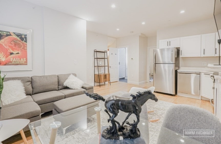 This bright, spacious 4 bedroom, 2 bath unit features an open layout. At 1,300 sq ft, the space is flooded with natural light. The kitchen is equipped with brand new stainless steel appliances, granite countertops, and bamboo floors. It also features an on demand heating and hot water system along with your own in unit washer and dryer. Out back you'll find an expansive deck overlooking a large fenced in backyard, perfect for outdoor entertaining and everyday living! Located in vibrant East Boston, minutes from the T-stop and with a bus stop right outside for an easy commute downtown. Plenty of street parking available with a free resident parking sticker!