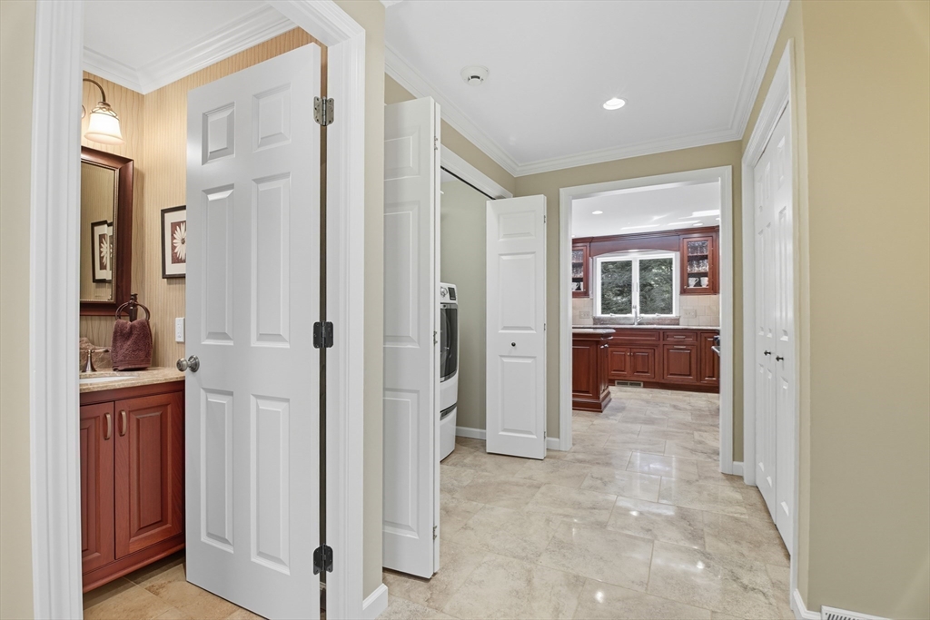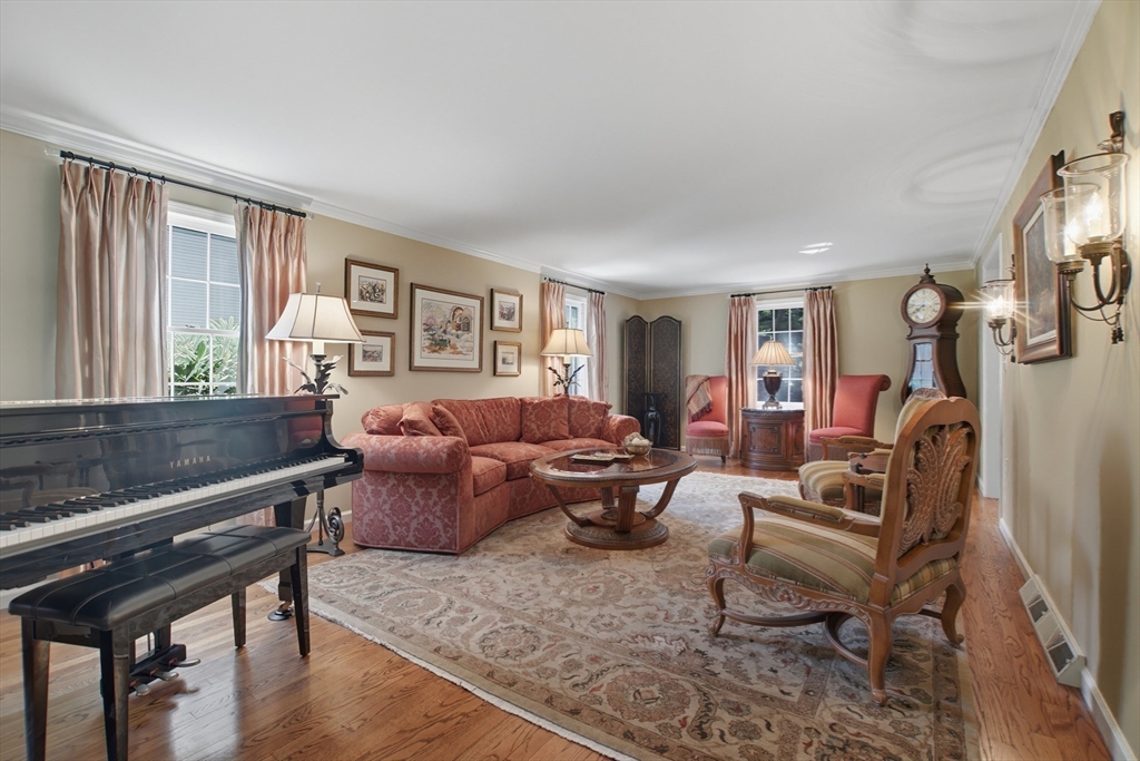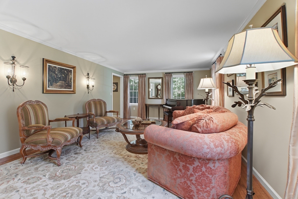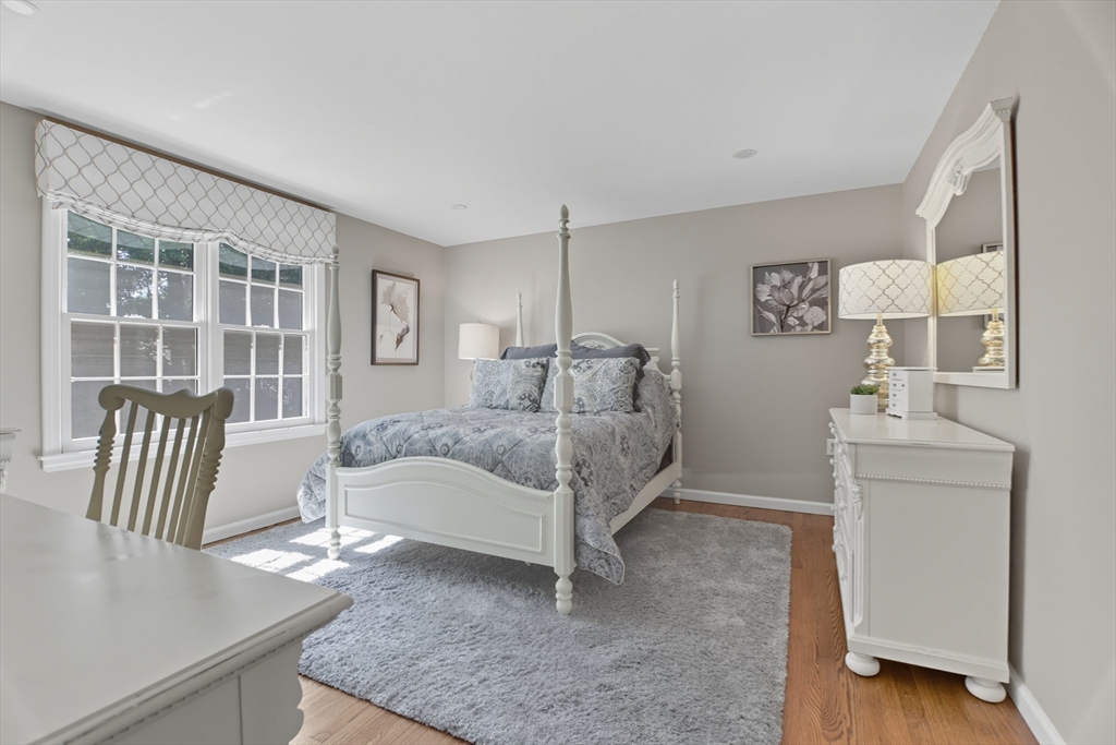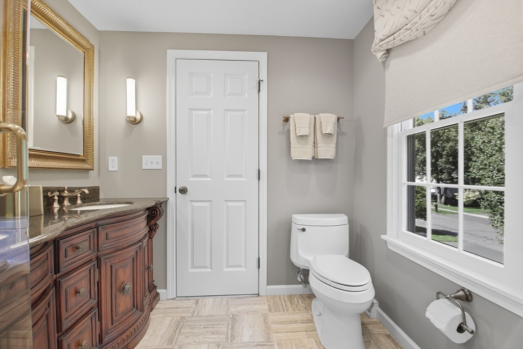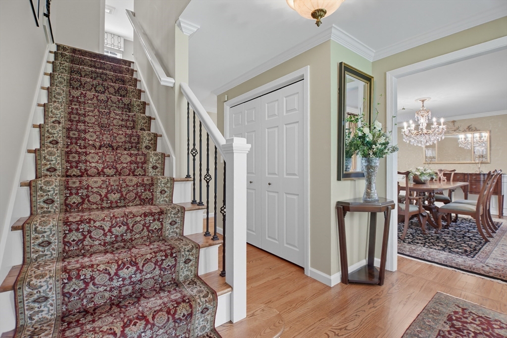 Elegant colonial residence sits on a beautifully landscaped lot in a prime neighborhood, exuding charm w/meticulous maintenance & thoughtful renovations throughout. Gracious front foyer welcomes w/sight lines to living room & sophisticated dining room featuring millwork & rich hardwood floors. Expansive gourmet custom kitchen, boasting warm cherry inset cabinetry, granite tops, premium appliances & eating area w/slider connects seamlessly to practical mudroom w/laundry & powder room. Adjacent family room offers built-ins, fireplace & abundant natural light, flowing to wood deck & private, serene backyard. Upstairs, a primary suite includes a renovated bath w/double vanity, glass-enclosed tiled shower & generous closet space. Three additional bedrooms share a stylish tiled bath w/double vanity. Finished lower level provides a spacious recreation room, home office & full tiled bath- ideal for relaxation or productivity. A perfect fusion of classic sophistication & modern functionality.