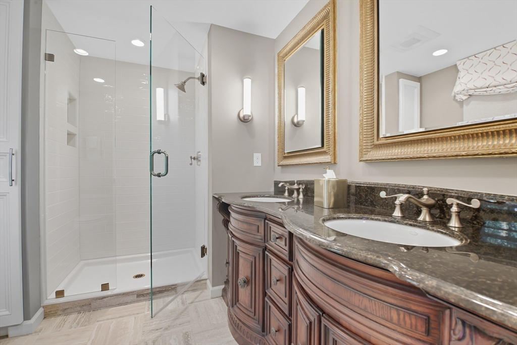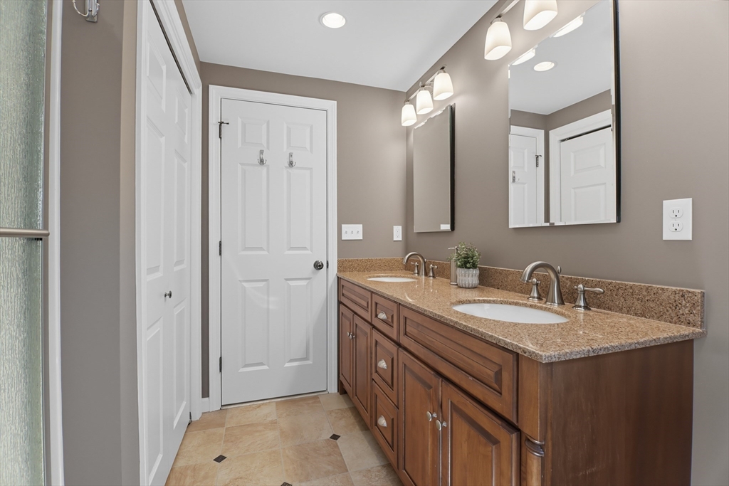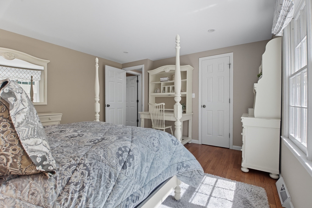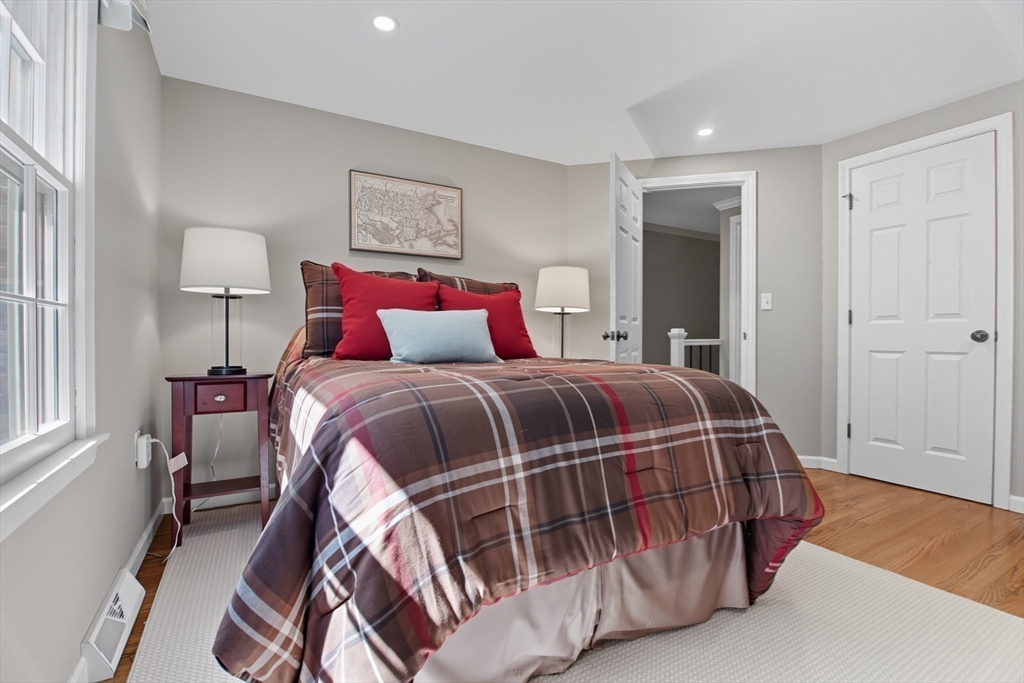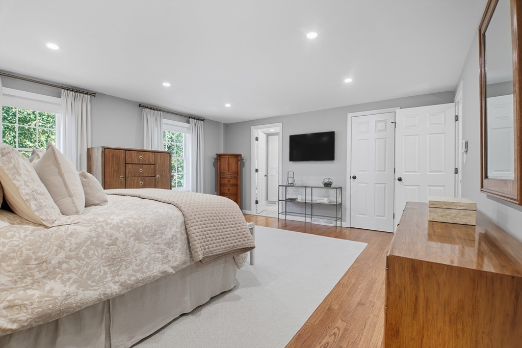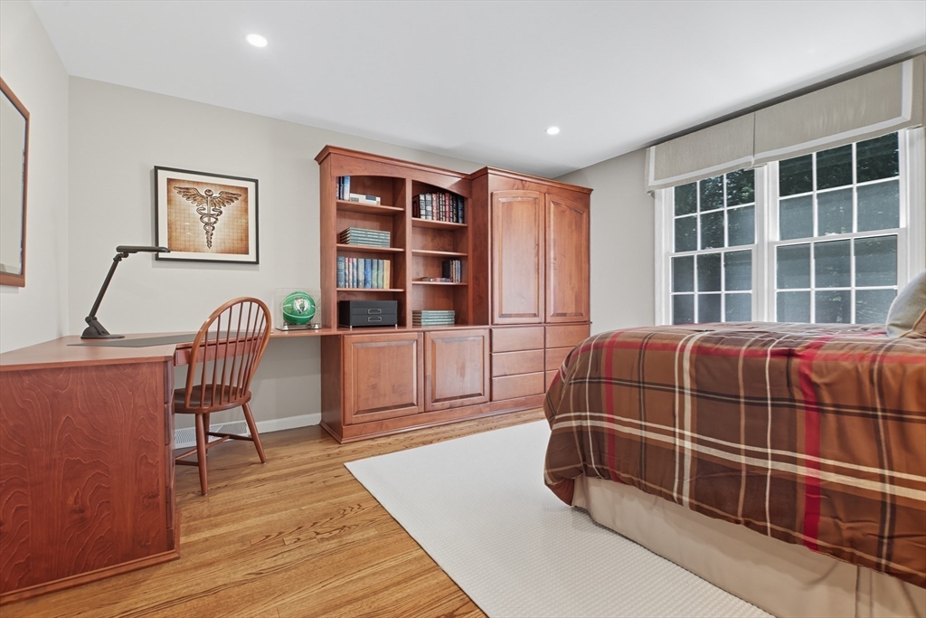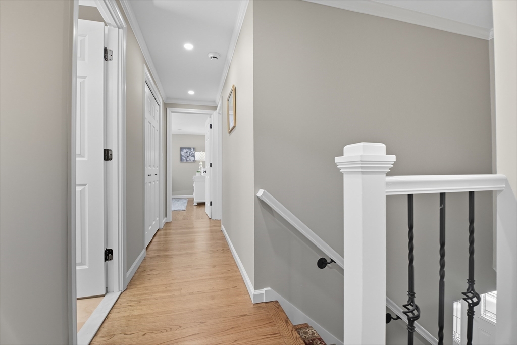 Elegant colonial residence sits on a beautifully landscaped lot in a prime neighborhood, exuding charm w/meticulous maintenance & thoughtful renovations throughout. Gracious front foyer welcomes w/sight lines to living room & sophisticated dining room featuring millwork & rich hardwood floors. Expansive gourmet custom kitchen, boasting warm cherry inset cabinetry, granite tops, premium appliances & eating area w/slider connects seamlessly to practical mudroom w/laundry & powder room. Adjacent family room offers built-ins, fireplace & abundant natural light, flowing to wood deck & private, serene backyard. Upstairs, a primary suite includes a renovated bath w/double vanity, glass-enclosed tiled shower & generous closet space. Three additional bedrooms share a stylish tiled bath w/double vanity. Finished lower level provides a spacious recreation room, home office & full tiled bath- ideal for relaxation or productivity. A perfect fusion of classic sophistication & modern functionality.