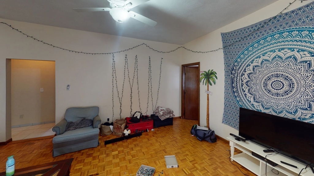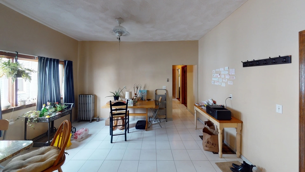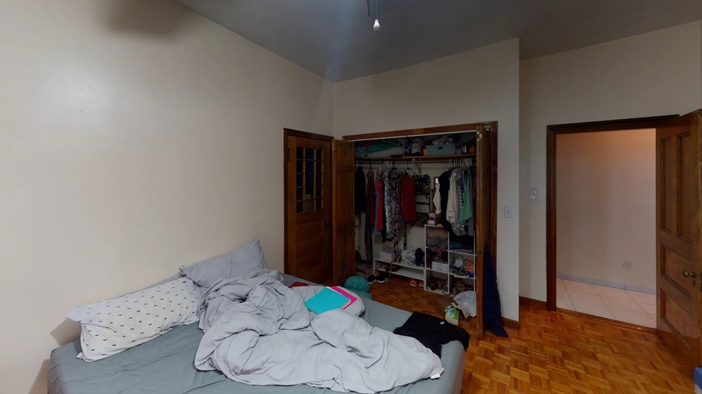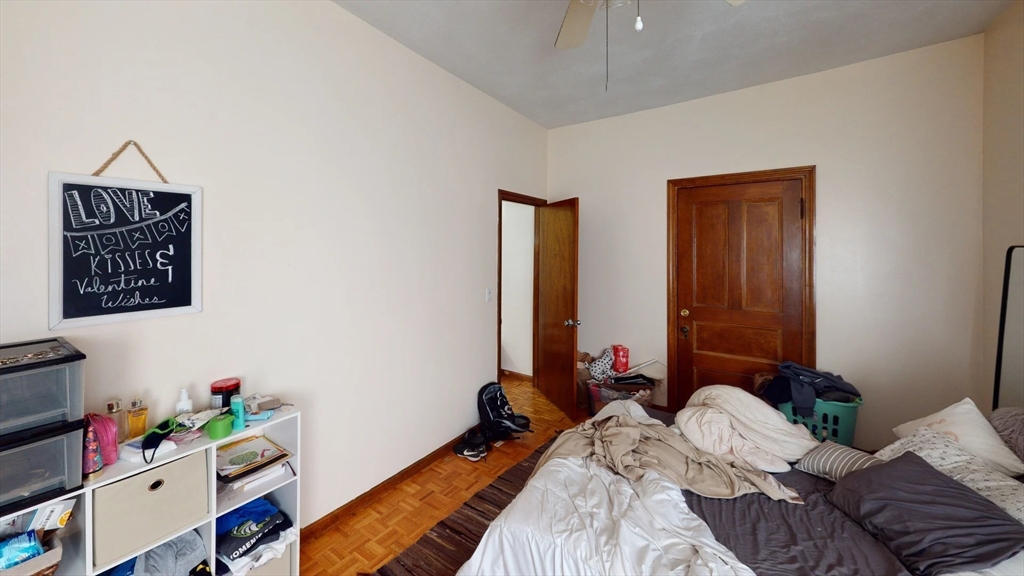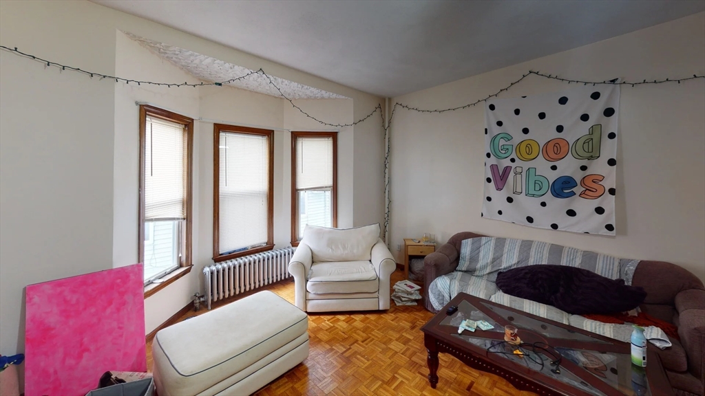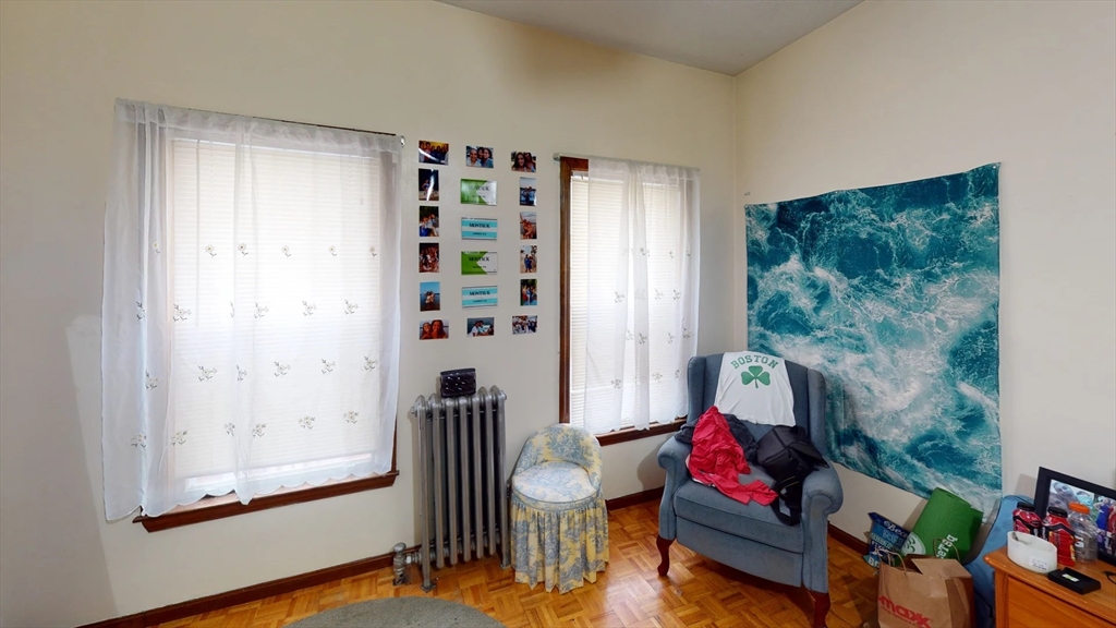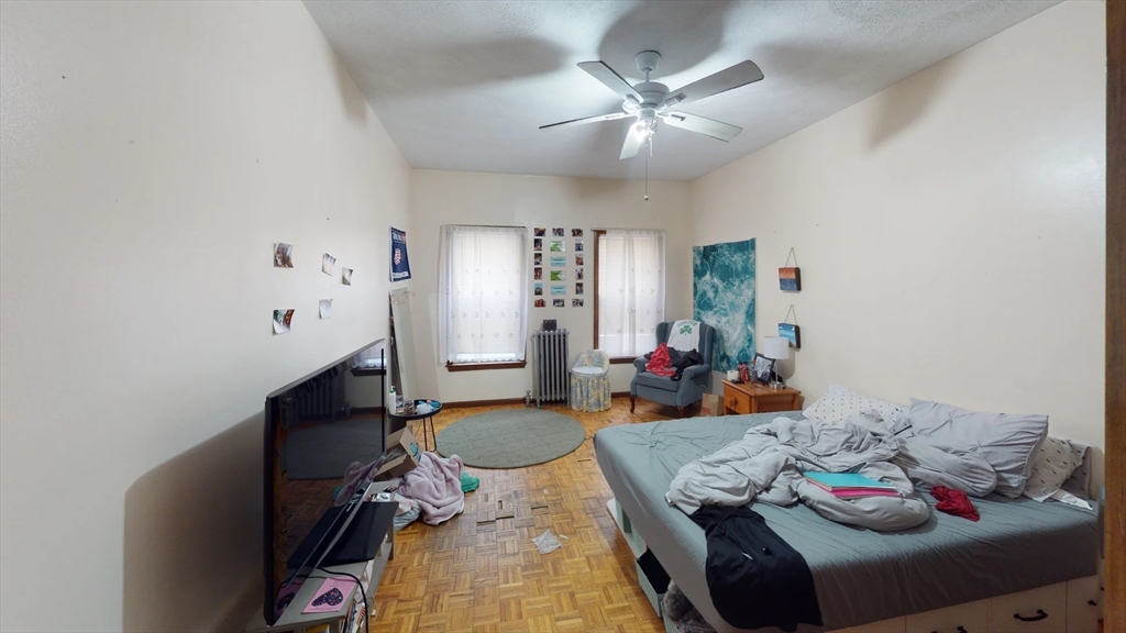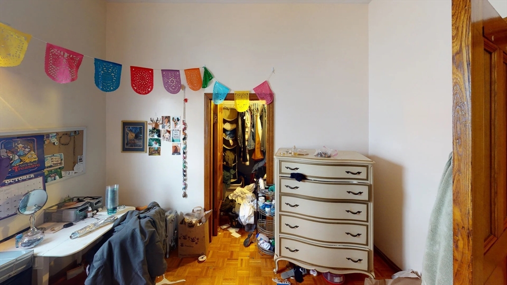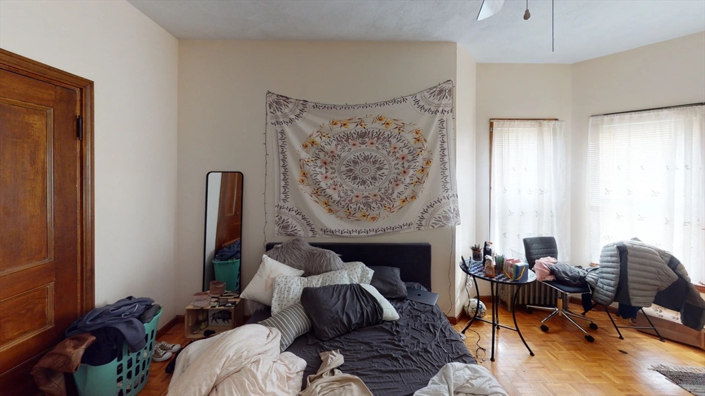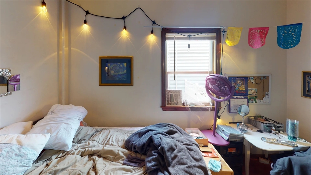 This single-story apartment showcases a blend of functionality and character. The living areas feature warm hardwood floors and large windows, allowing ample natural light. The kitchen stands out with dark cabinets, stainless steel appliances, and granite countertops. Bedrooms are personalized with tapestries, string lights, and colorful decor, creating a youthful, bohemian atmosphere. A full bathroom with white tiles and a shower/tub combination offers practicality. The apartment's open layout and multi-purpose spaces, like a study area with a desk, make efficient use of the available square footage. Radiators throughout hint at the building's vintage charm, while modern amenities ensure comfort. Parking will never be an issue with off-street parking available for one car at an additional fee of $100 per month. In addition, you'll have the convenience of free laundry facilities in the basement, making laundry day a breeze.