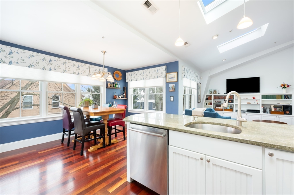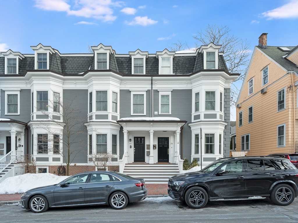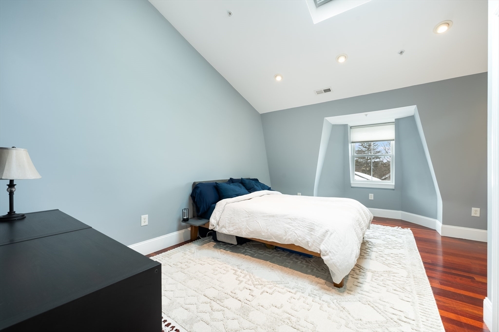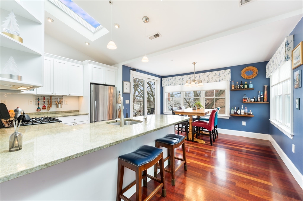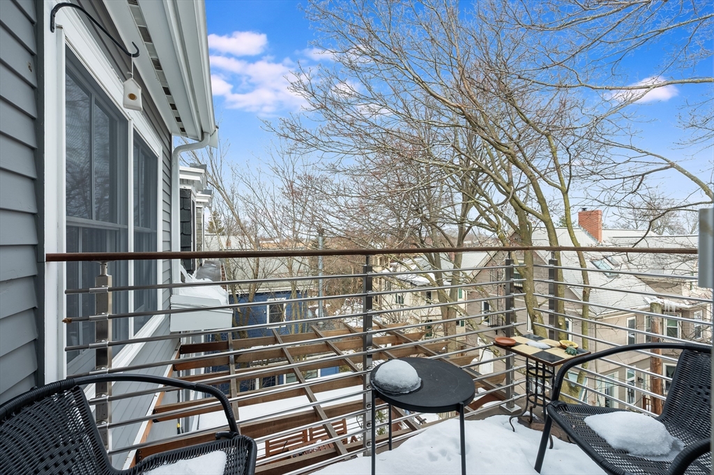 Meticulously maintained and updated three bedroom, two bathroom condo with ensuite bathroom. Open floor plan with ample windows in light-filled living room, dining area, and kitchen. Penthouse treetop views with a quaint outdoor balcony. Full-sized in-unit washer and dryer. Many updated mechanical systems including on-demand hot water heater and heat pump compressor (see Update Sheet). Condo association is pet friendly. Additional storage closet on lowest level. Located on a tree-lined street near Raymond Park. About .8 miles from the Porter Square T stop.