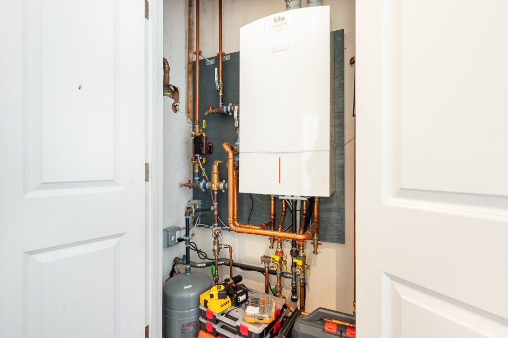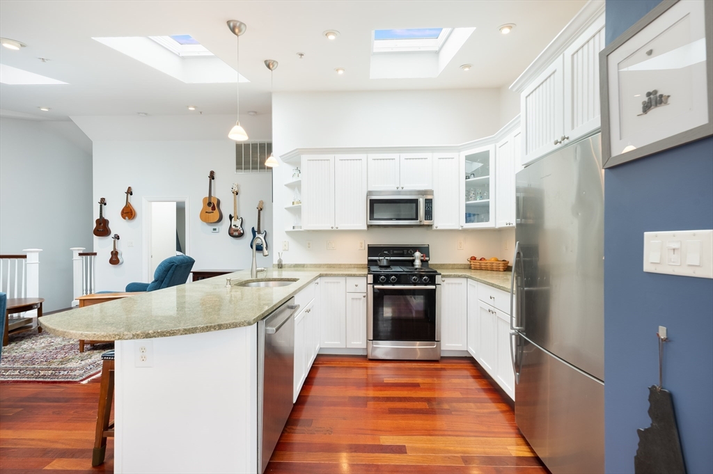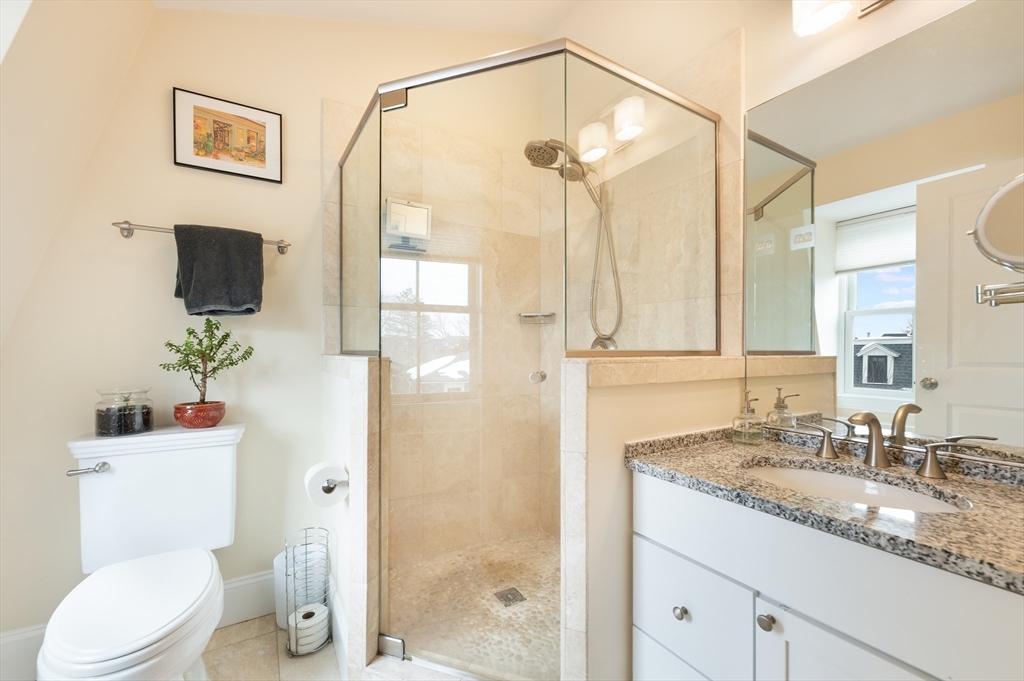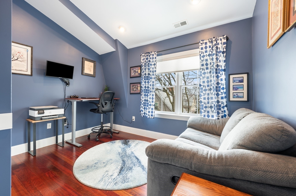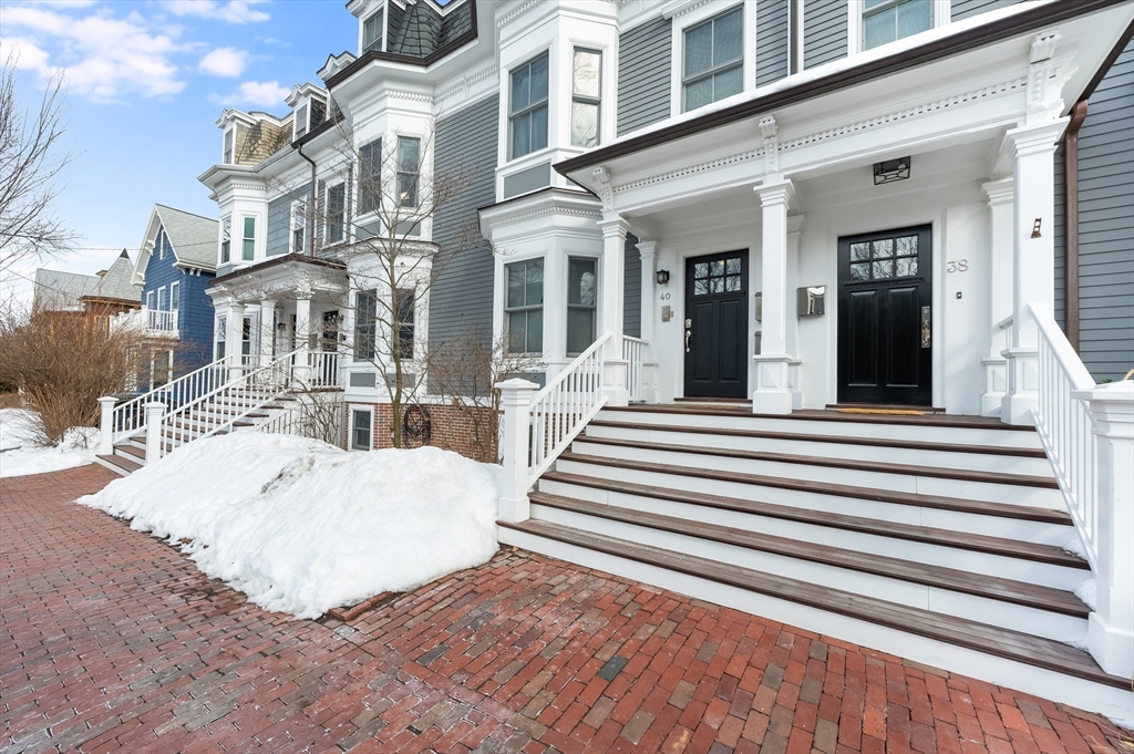 Meticulously maintained and updated three bedroom, two bathroom condo with ensuite bathroom. Open floor plan with ample windows in light-filled living room, dining area, and kitchen. Penthouse treetop views with a quaint outdoor balcony. Full-sized in-unit washer and dryer. Many updated mechanical systems including on-demand hot water heater and heat pump compressor (see Update Sheet). Condo association is pet friendly. Additional storage closet on lowest level. Located on a tree-lined street near Raymond Park. About .8 miles from the Porter Square T stop.