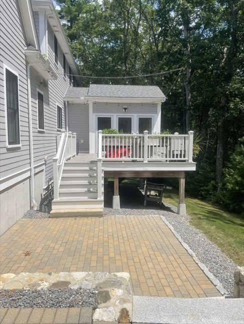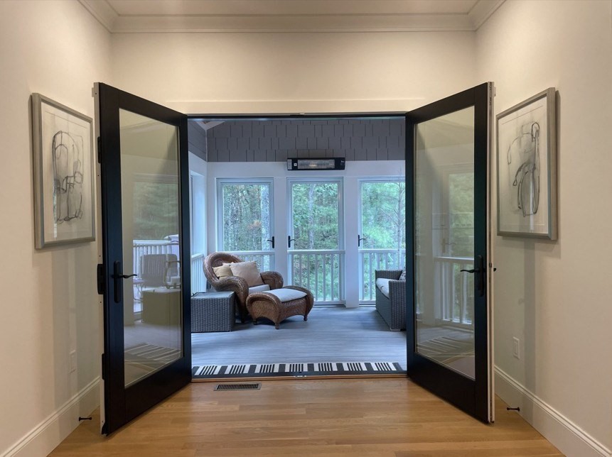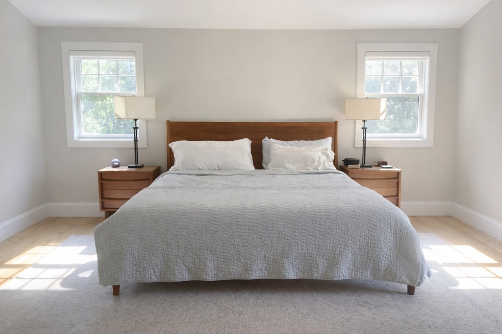 Privately sited in a tranquil high-end neighborhood abutting conservation land, this Nantucket-style Colonial blends timeless architecture w/contemporary California-inspired interior. An open floor plan seamlessly connects the kitchen & family room, showcasing white oak flooring throughout main & upper levels. The custom kitchen features inset cabinetry, a white oak butcher block countertop, lg island & premium Sub-Zero and Thermador appliances. Open the Pella French doors to a beautiful 3-season sunporch which leads to a large deck overlooking a manicured lawn w/stone fireplace for evening relaxation. The spacious primary suite offers sitting area, walk-in closet, & stunning spa-like bath. The fully finished walk-out lower level has kitchenette, living area w/fireplace, full bath & luxury vinyl plank flooring. Add’l highlights include a 3-car garage w/epoxy floor & built-in storage, Generac whole-house generator. Numerous high-end custom upgrades complete this exceptional offering.