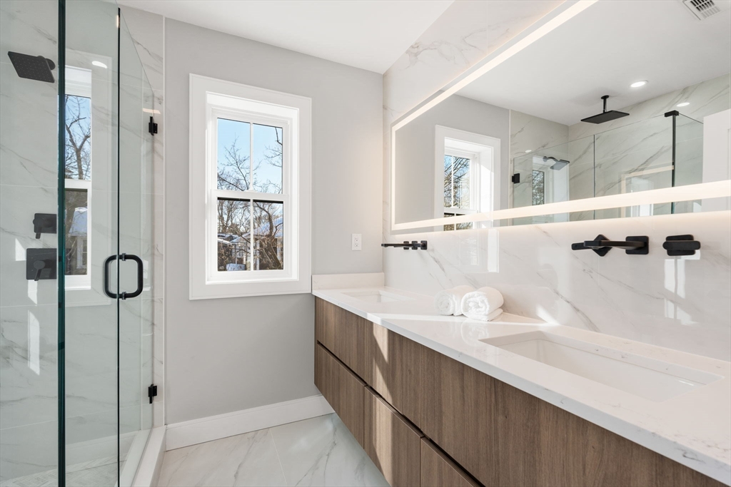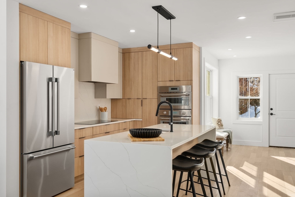 Welcome to 298 Cabot Street, a brand-new luxury townhome in the heart of Newton. Approximately 2,865 sq ft of refined living across four levels, featuring 4 bedrooms, 4.5 baths, and an office. The open-concept main level showcases a chef’s kitchen with custom Metropolitan cabinets, Thermador appliances including a double oven, and quartz countertops, opening to a sun-filled dining area with access to a private patio and yard. Upstairs, the serene primary suite includes custom closets and a spa-like bath with heated floors. The lower level, plumbed for a wet bar is an ideal space for a family room, and the finished attic provides flexible space for a bedroom or a gym. Designed with tiles and finishes curated by Kristin Conrad Interior Design, each home includes a detached carport, an additional parking space with EV outlets, and high-efficiency ductless HVAC system with 8 zones. Convenient to schools, parks, shops, and major routes.
