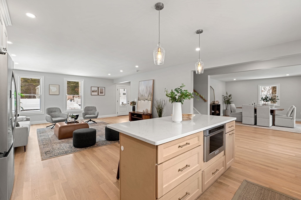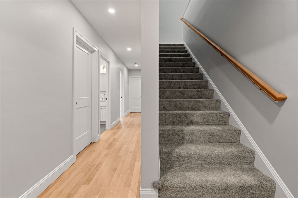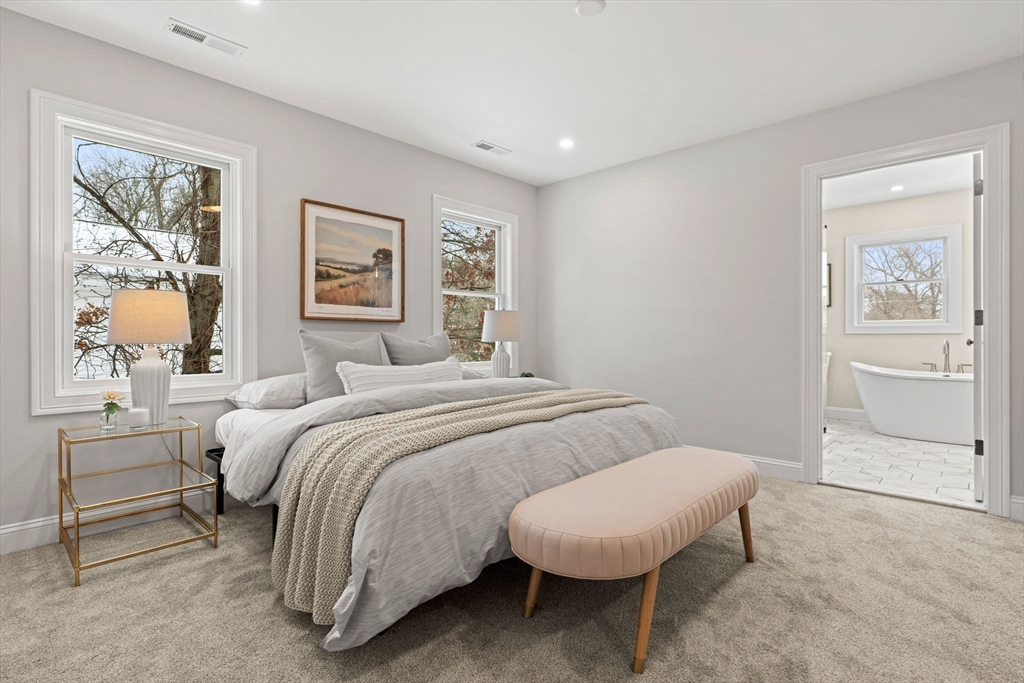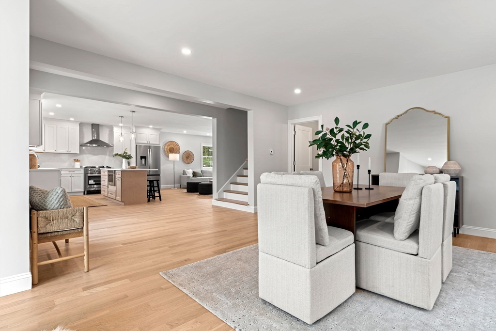 Stunning HERS energy-efficient 4 bedroom, 2.5 bath offering 3,187 SF across three finished above-grade levels. Situated on a flat, cleared lot with frontage on two streets—offering added flexibility and future possibilities. Designer kitchen features white cabinetry with under-cabinet lighting, quartz countertops with full quartz backsplash, stainless appliances, hood vent, built-in microwave, 36" gas range, and contrasting island with seating. Open layout to spacious living and formal dining rooms with elegant light hardwood floors and access to a large maintenance-free deck. First floor also includes a powder room and office. Upstairs offers four generous bedrooms, including an impressive primary suite with oversized walk-in closet and ensuite bath with tiled shower + niche, glass enclosure, and soaking tub. Guest bath and 2nd-floor laundry complete this level. Walk-up attic hosts a spacious family room with recessed lighting.