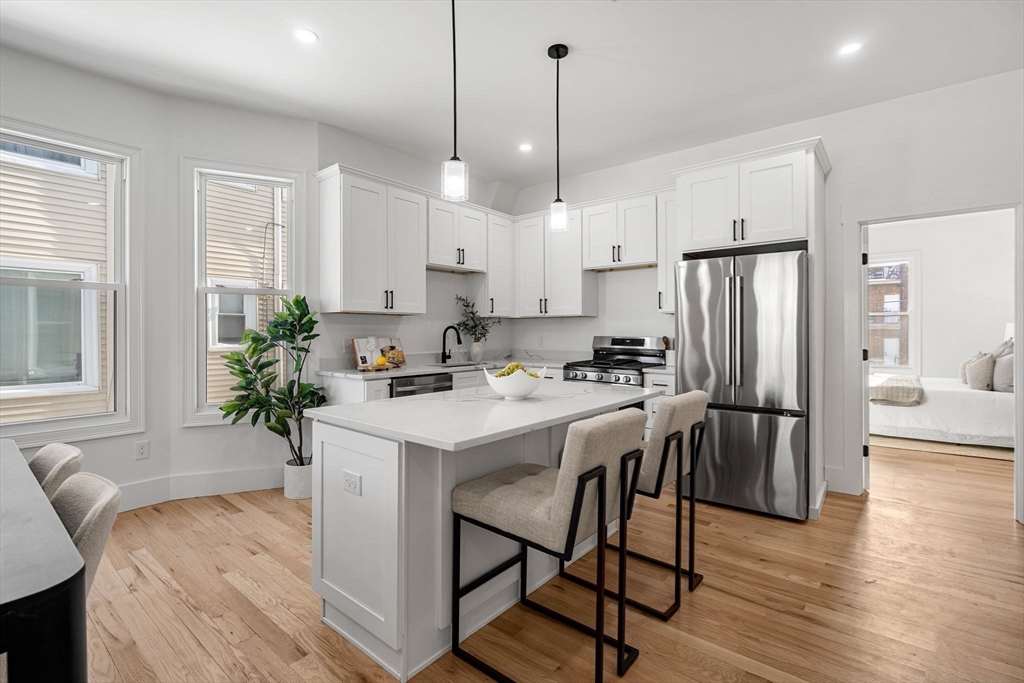 Stunning newly gut-renovated bi-level condo in the heart of the Dorchester/Roxbury line. This expansive 3-bedroom, 3.5-bath residence showcases sleek white quartz countertops, beautifully curated bathrooms, and generously sized bedrooms throughout. The open-concept dining, living and entertaining space is flooded with natural light from oversized windows, creating a bright and welcoming atmosphere. Upper level features two bedrooms both with en suite baths and the main level layout offers an alcove with ideal flexibility for a home office, gym, or additional living space. Off-street parking included! Conveniently located near Boston Latin School, Longwood Medical Area, Northeastern University, UMass Boston, and Roxbury Community College—this home blends modern living with unbeatable access to the city. If you are looking for great value this spacious unit cannot be missed!